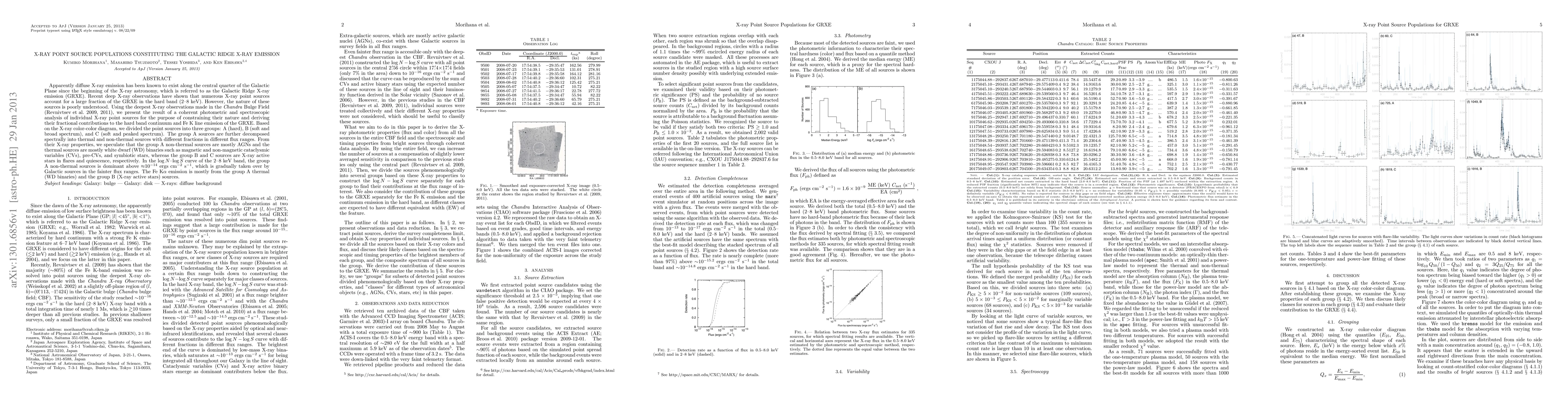 This paper analyzes X-ray point sources contributing to the Galactic Ridge X-ray emission, identifying three groups based on spectral characteristics. Group A non-thermal sources, likely AGNs, dominate at higher fluxes, while thermal sources, such as white dwarf binaries, contribute to Fe K\alpha emission.