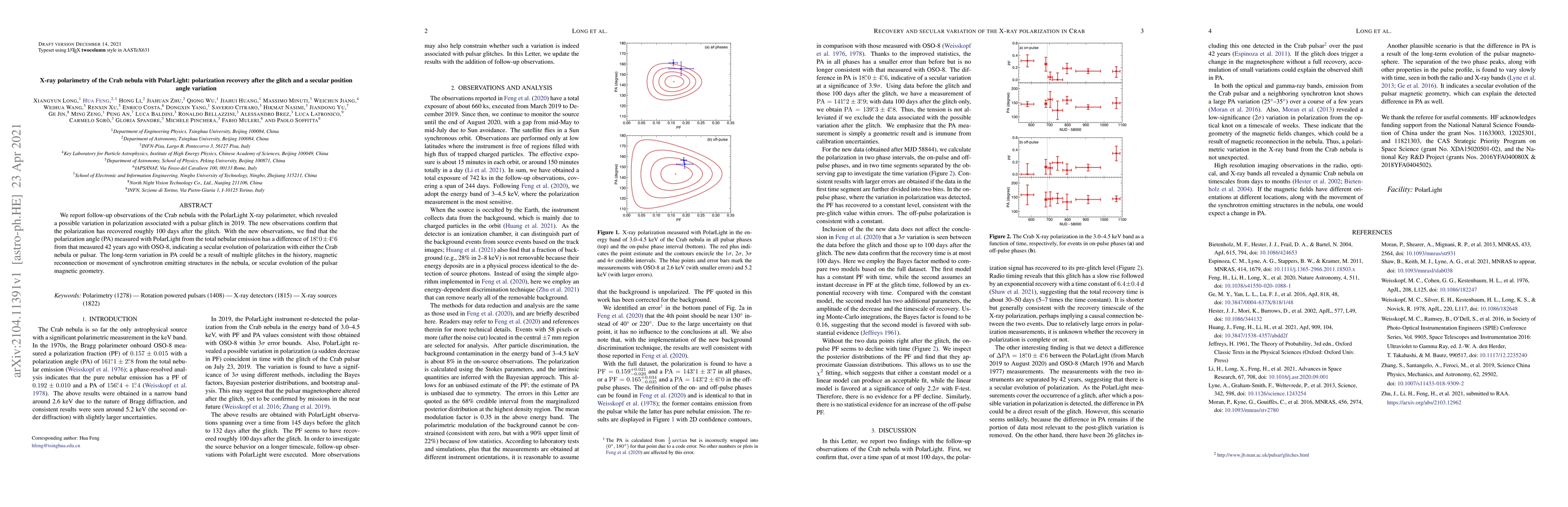New X-ray polarimeter observations confirm polarization recovery in Crab nebula 100 days after glitch, showing a secular position angle variation of 18 degrees over 42 years.