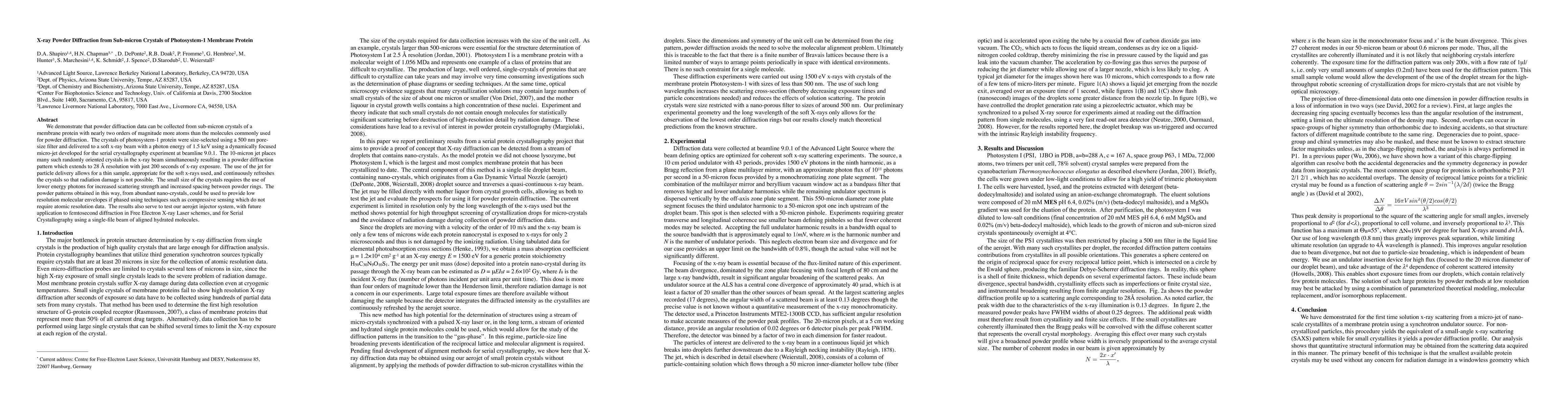 This paper demonstrates the collection of x-ray powder diffraction data from sub-micron crystals of photosystem-1 membrane protein using a dynamically focused micro-jet system, achieving a resolution of 28 angstroms in 200 seconds. The method minimizes radiation damage and paves the way for low-resolution molecular envelope determination and future applications in femtosecond diffraction and serial crystallography.