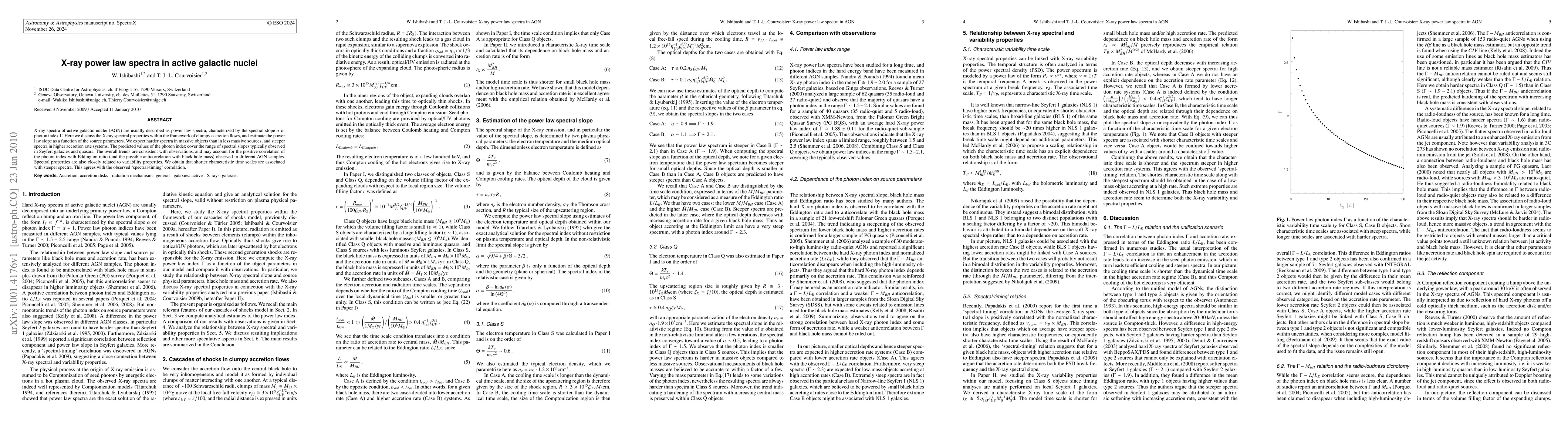 This paper explores the X-ray power law spectra of active galactic nuclei (AGN) within the context of clumpy accretion flows, predicting that massive and high accretion rate systems exhibit harder and steeper spectra, respectively. The findings align with observed trends and correlations, such as the positive relationship between photon index and Eddington ratio.