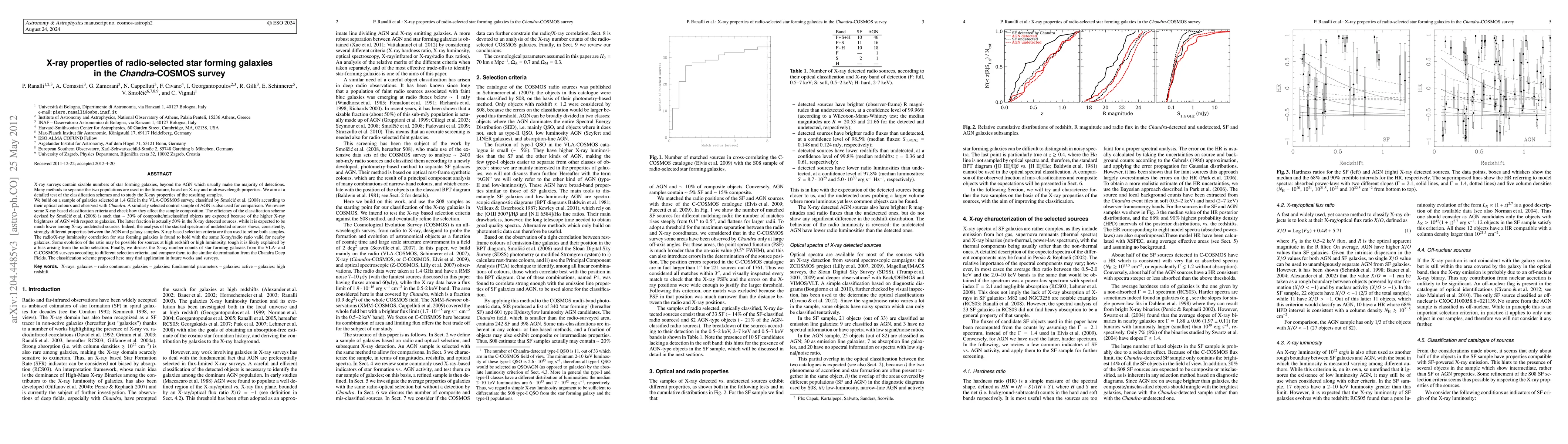X-ray surveys contain sizable numbers of star forming galaxies, beyond the AGN which usually make the majority of detections. Many methods to separate the two populations are used in the literature, based on X-ray and multiwavelength properties. We aim at a detailed test of the classification schemes and to study the X-ray properties of the resulting samples. We build on a sample of galaxies selected at 1.4 GHz in the VLA-COSMOS survey, classified by Smolcic et al. (2008) according to their optical colours and observed with Chandra. A similarly selected control sample of AGN is also used for comparison. We review some X-ray based classification criteria and check how they affect the sample composition. The efficiency of the classification scheme devised by Smolcic et al. (2008) is such that ~30% of composite/misclassified objects are expected because of the higher X-ray brightness of AGN with respect to galaxies. The latter fraction is actually 50% in the X-ray detected sources, while it is expected to be much lower among X-ray undetected sources. Indeed, the analysis of the stacked spectrum of undetected sources shows, consistently, strongly different properties between the AGN and galaxy samples. X-ray based selection criteria are then used to refine both samples. The radio/X-ray luminosity correlation for star forming galaxies is found to hold with the same X-ray/radio ratio valid for nearby galaxies. Some evolution of the ratio may be possible for sources at high redshift or high luminosity, tough it is likely explained by a bias arising from the radio selection. Finally, we discuss the X-ray number counts of star forming galaxies from the VLA- and C-COSMOS surveys according to different selection criteria, and compare them to the similar determination from the Chandra Deep Fields. The classification scheme proposed here may find application in future works and surveys.