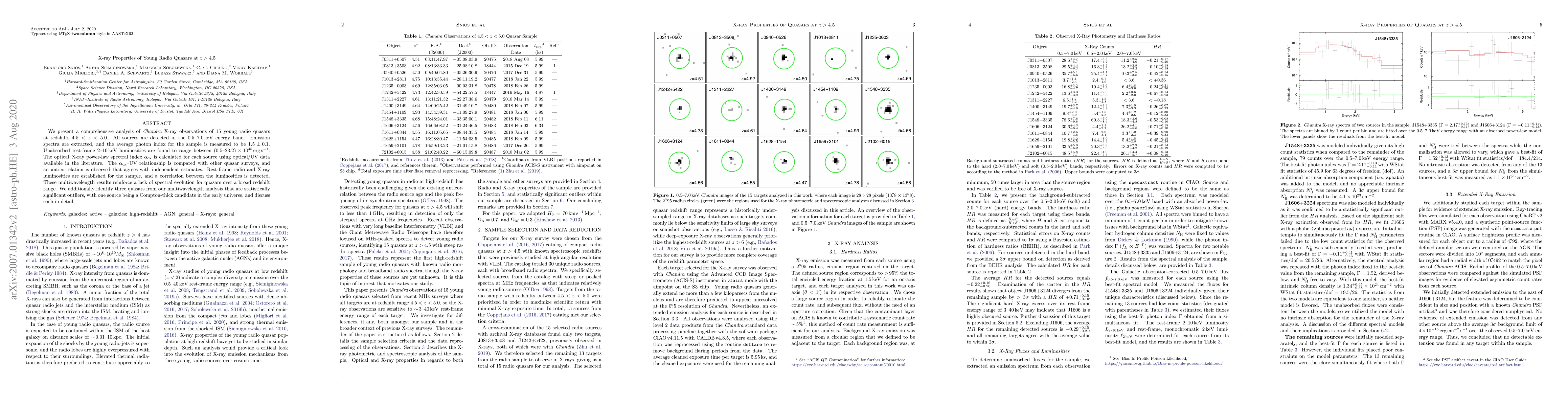 This paper analyzes Chandra X-ray observations of 15 young radio quasars at redshifts $4.5 < z < 5.0$, finding an average photon index of $1.5\pm0.1$ and a range of rest-frame $2-10$ keV luminosities from $(0.5-23.2) \times 10^{45}$ erg s$^{-1}$. It identifies a correlation between radio and X-ray luminosities, reinforcing the lack of spectral evolution in quasars across a broad redshift range.