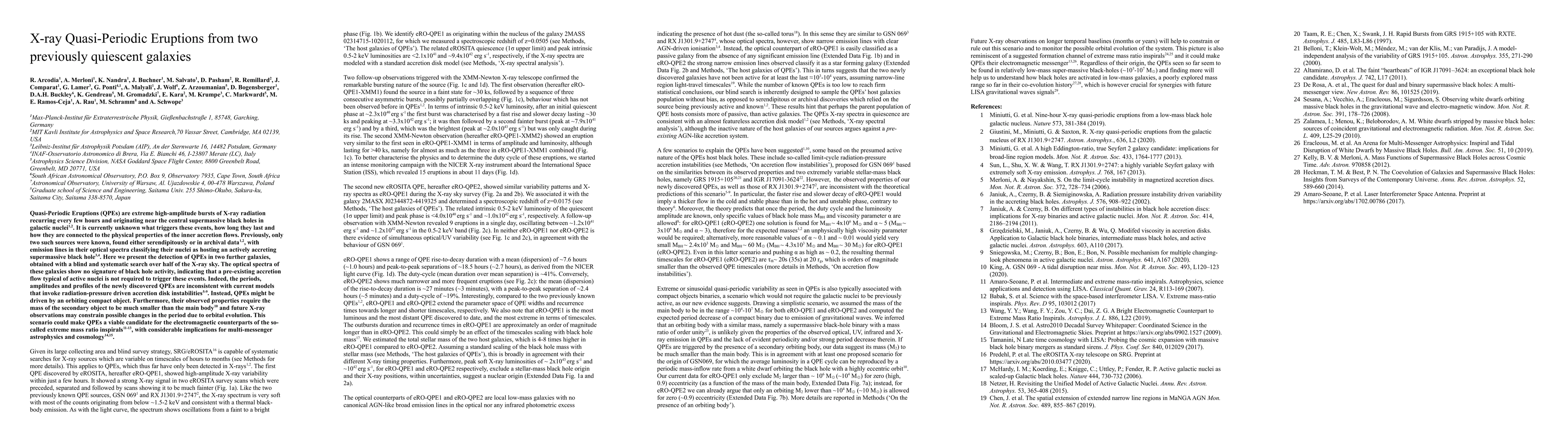 This paper reports the detection of Quasi-Periodic Eruptions (QPEs) in two previously quiescent galaxies, challenging existing models that require active accretion flows. The findings suggest QPEs may instead be driven by an orbiting compact object, potentially linking them to extreme mass ratio inspirals and offering new insights into multi-messenger astrophysics.