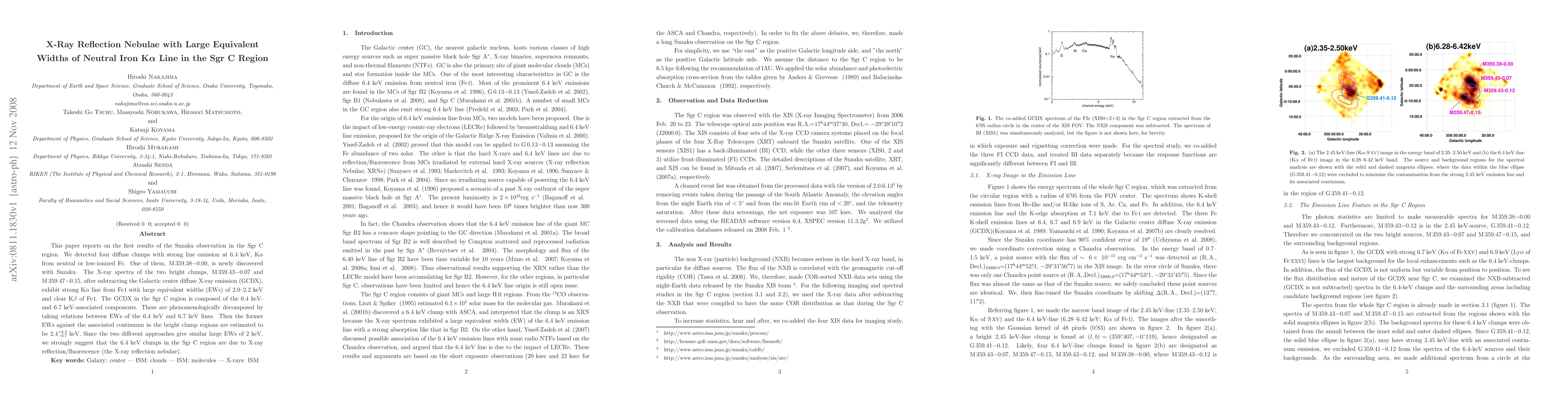 Researchers used Suzaku to detect X-ray reflection nebulae with large equivalent widths of neutral iron in the Sgr C region, suggesting these phenomena occur through X-ray reflection/fluorescence.