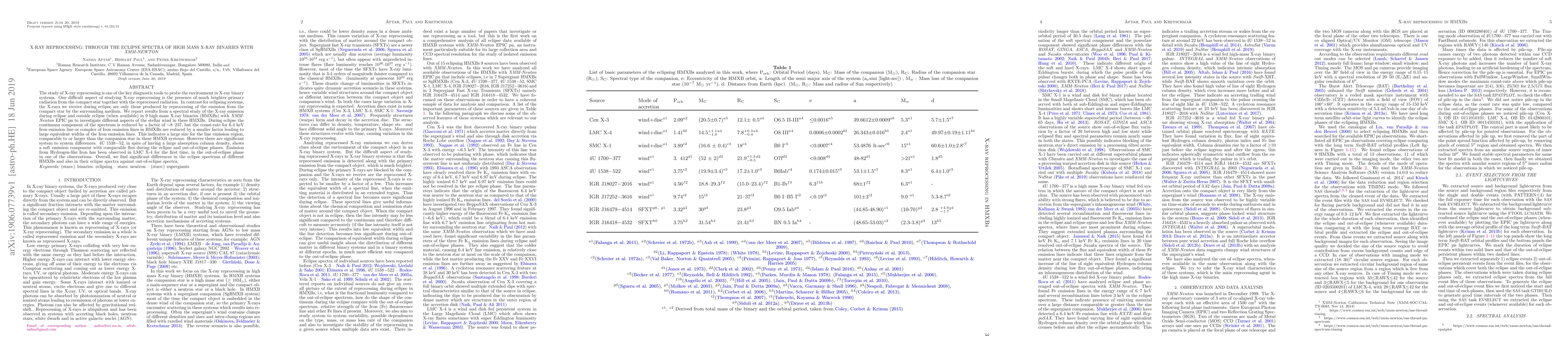 This study investigates X-ray reprocessing in high mass X-ray binaries (HMXBs) using XMM-Newton data, finding that during eclipses, the continuum spectrum is significantly reduced while the Iron emission lines remain relatively strong, indicating a large reprocessing region. Significant differences in eclipse spectra among HMXBs were observed, highlighting variations in the stellar wind and reprocessing mechanisms.