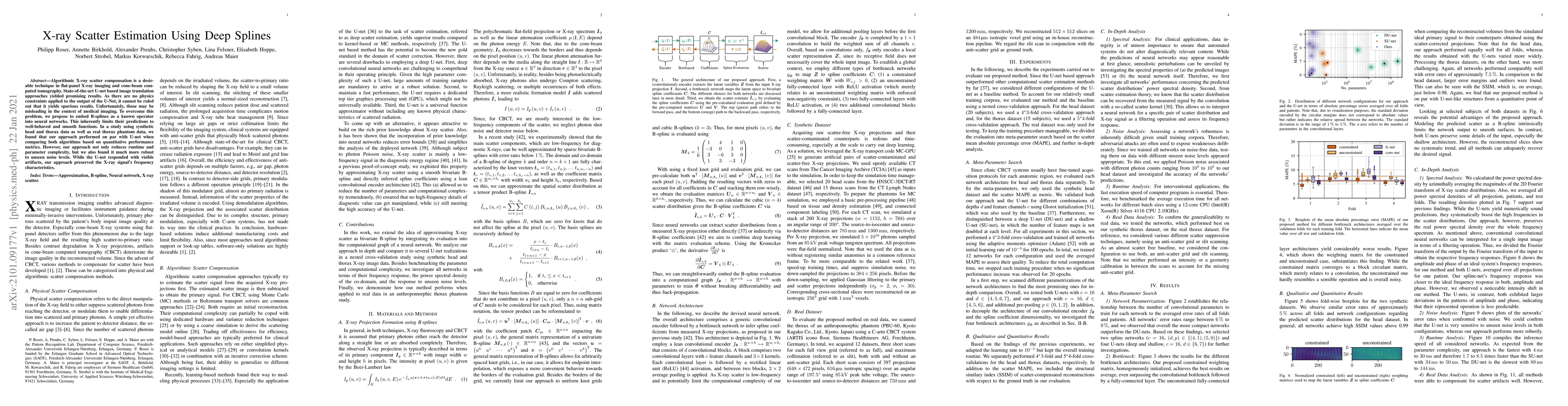 This paper proposes using deep splines to estimate X-ray scatter in imaging, embedding B-splines into neural networks to enforce physics constraints and reduce spurious results. The approach performs competitively with U-nets but is more robust to noise and preserves signal frequency characteristics.