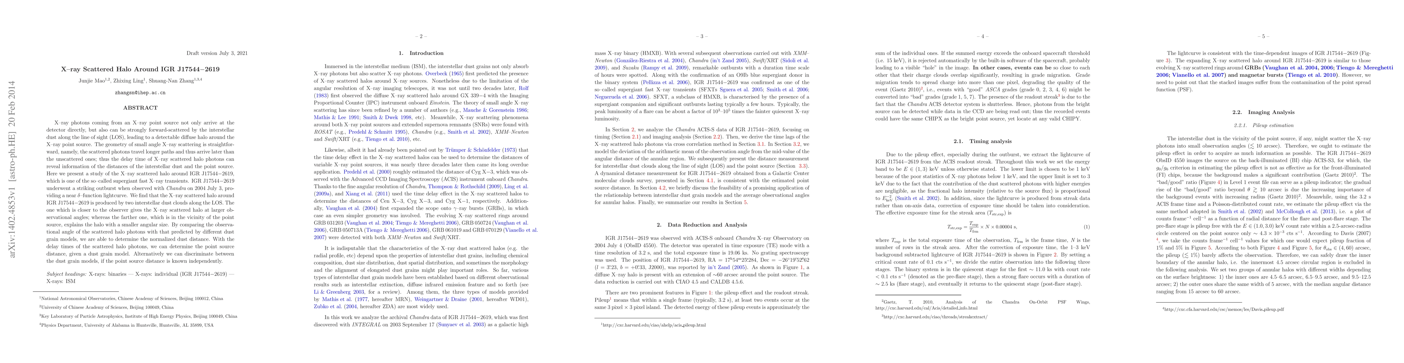 X-ray photons coming from an X-ray point source not only arrive at the detector directly, but also can be strongly forward-scattered by the interstellar dust along the line of sight (LOS), leading to a detectable diffuse halo around the X-ray point source. The geometry of small angle X-ray scattering is straightforward, namely, the scattered photons travel longer paths and thus arrive later than the unscattered ones; thus the delay time of X-ray scattered halo photons can reveal information of the distances of the interstellar dust and the point source. Here we present a study of the X-ray scattered around IGR J17544-2619, which is one of the so-called supergiant fast X-ray transients. IGR J17544-2619 underwent a striking outburst when observed with Chandra on 2004 July 3, providing a near delta-function lightcurve. We find that the X-ray scattered halo around IGR J17544-2619 is produced by two interstellar dust clouds along the LOS. The one which is closer to the observer gives the X-ray scattered at larger observational angles; whereas the farther one, which is in the vicinity of the point source, explains the halo with a smaller angular size. By comparing the observational angle of the scattered halo photons with that predicted by different dust grain models, we are able to determine the normalized dust distance. With the delay times of the scattered halo photons, we can determine the point source distance, given a dust grain model. Alternatively we can discriminate between the dust grain models, given the point source distance.