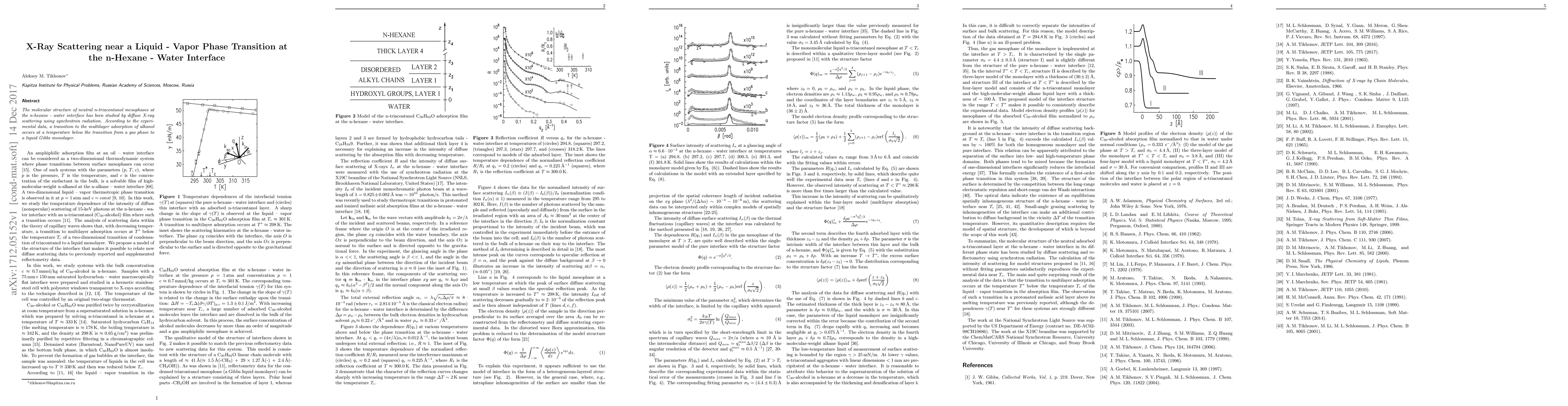 Summary: This study uses synchrotron radiation X-ray scattering to investigate the molecular structure of n-triacontanol at the n-hexane-water interface, revealing a transition to multilayer alcanol adsorption below the liquid-gas phase transition temperature.