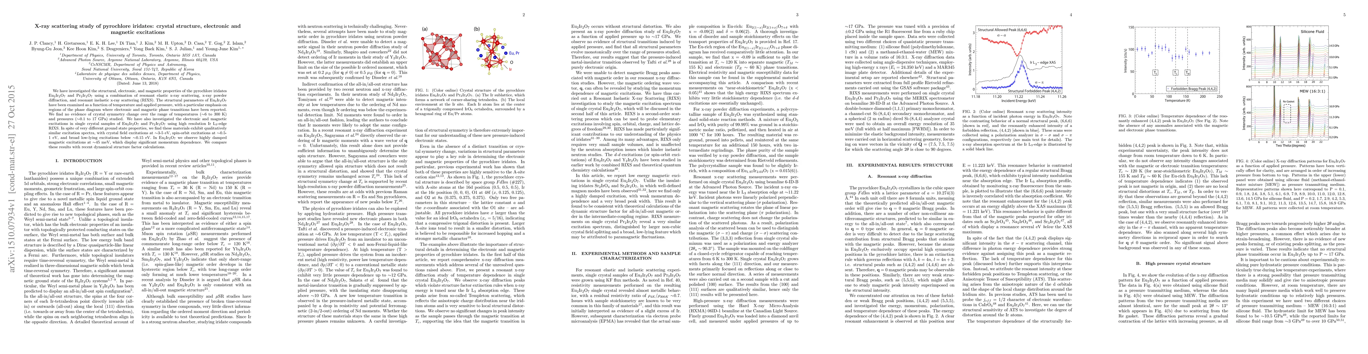 This study uses resonant elastic and inelastic x-ray scattering to examine the structural, electronic, and magnetic properties of pyrochlore iridates Eu2Ir2O7 and Pr2Ir2O7. No crystal symmetry change is found over varied temperature and pressure conditions, and similar excitation spectra are observed despite differing ground state properties.