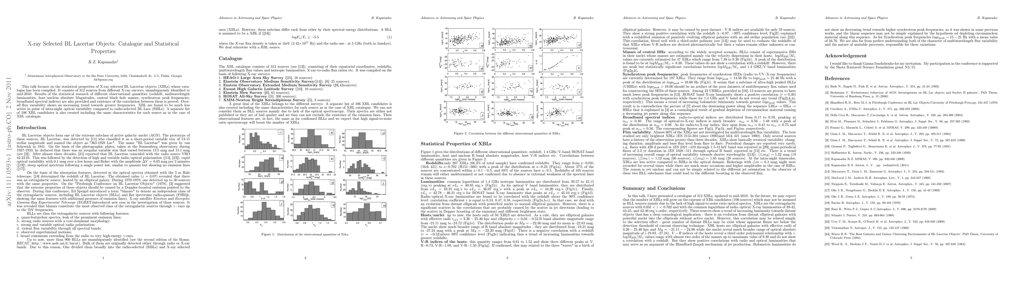 This talk focuses on the statistical properties of X-ray selected BL Lacertae objects (XBLs) whose catalogue has been compiled. It consists of 312 sources from different X-ray surveys, unambiguously identified to mid-2010. Results of the statistical research of different observational quantities (redshift, muliwavelength luminosities, host/nucleus absolute Magnitudes, central black hole masses, synchrotron peak frequencies, broadband spectral indices) are also provided and existence of the correlation between them is proved. Overall flux variability shows an increasing trend towards greater frequencies. XBL are found to be much less active in point of intra-night optical variability compared to radio-selected BL Lacs (RBLs). A separate list of 106 XBL candidates is also created including the same characteristics for each source as in the case of XBL catalogue.