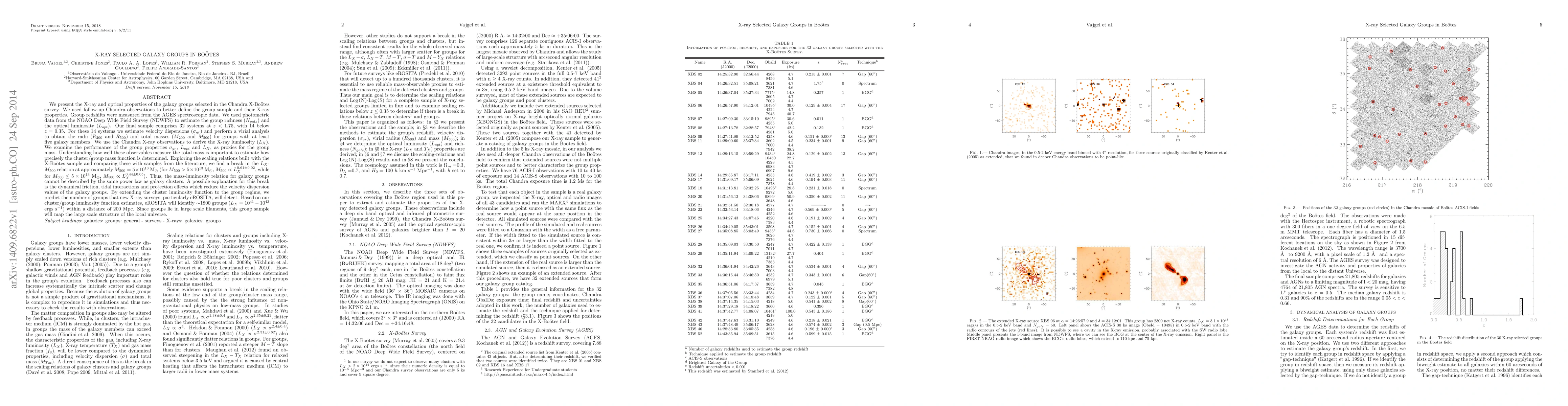 We present the X-ray and optical properties of the galaxy groups selected in the Chandra X-Bo\"otes survey. Our final sample comprises 32 systems at \textbf{$z<1.75$}, with 14 below $z = 0.35$. For these 14 systems we estimate velocity dispersions ($\sigma_{gr}$) and perform a virial analysis to obtain the radii ($R_{200}$ and $R_{500}$) and total masses ($M_{200}$ and $M_{500}$) for groups with at least five galaxy members. We use the Chandra X-ray observations to derive the X-ray luminosity ($L_X$). We examine the performance of the group properties $\sigma_{gr}$, $L_{opt}$ and $L_X$, as proxies for the group mass. Understanding how well these observables measure the total mass is important to estimate how precisely the cluster/group mass function is determined. Exploring the scaling relations built with the X-Bo\"otes sample and comparing these with samples from the literature, we find a break in the $L_X$-$M_{500}$ relation at approximately $M_{500} = 5\times10^{13}$ M$_\odot$ (for $M_{500} > 5\times10^{13}$ M$_\odot$, $M_{500} \propto L_X^{0.61\pm0.02}$, while for $M_{500} \leq 5\times10^{13}$ M$_\odot$, $M_{500} \propto L_X^{0.44\pm0.05}$). Thus, the mass-luminosity relation for galaxy groups cannot be described by the same power law as galaxy clusters. A possible explanation for this break is the dynamical friction, tidal interactions and projection effects which reduce the velocity dispersion values of the galaxy groups. By extending the cluster luminosity function to the group regime, we predict the number of groups that new X-ray surveys, particularly eROSITA, will detect. Based on our cluster/group luminosity function estimates, eROSITA will identify $\sim$1800 groups ($L_X = 10^{41}-10^{43}$ ergs s$^{-1}$) within a distance of 200 Mpc. Since groups lie in large scale filaments, this group sample will map the large scale structure of the local universe.
