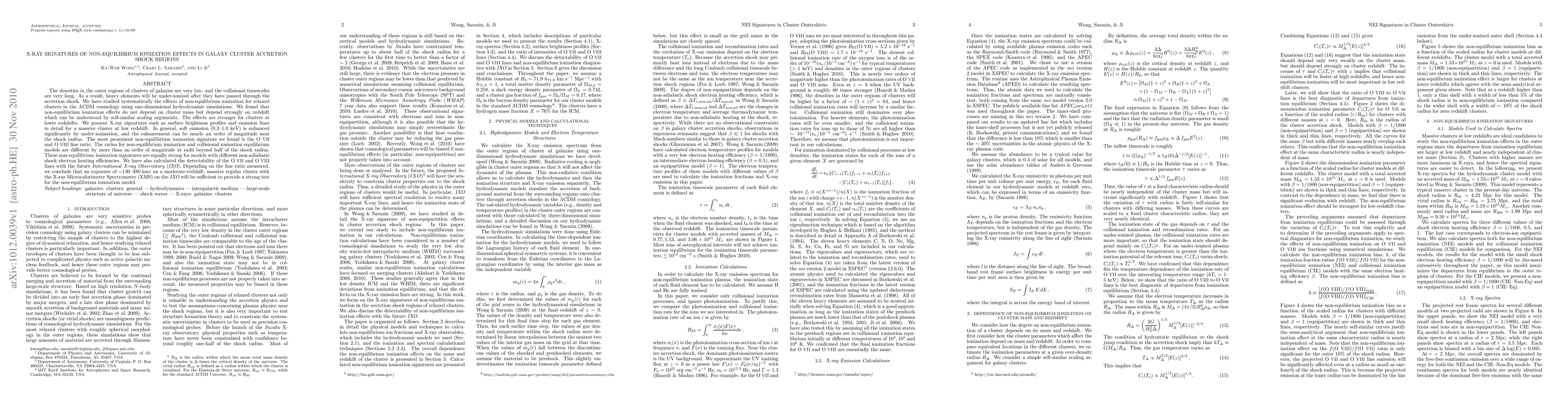 This paper investigates non-equilibrium ionization effects in the accretion shock regions of galaxy clusters using hydrodynamic simulations. It finds that these effects, which enhance soft X-ray emission, depend strongly on redshift rather than cluster mass and are detectable via the O VII and O VIII line ratios, suggesting future observations with the International X-ray Observatory could confirm these non-equilibrium signatures.