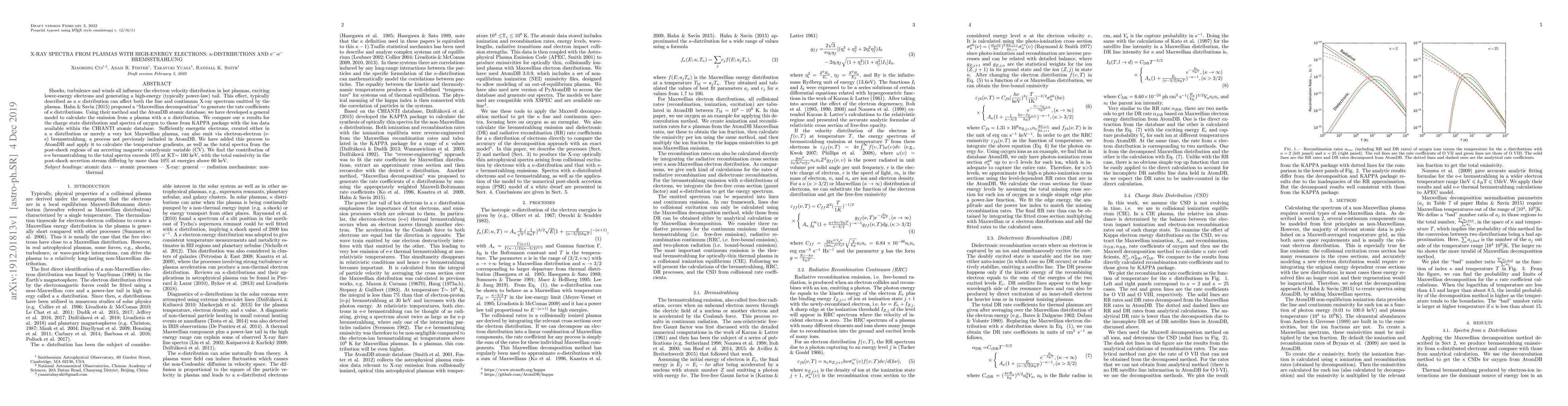 Shocks, turbulence and winds all influence the electron velocity distribution in hot plasmas, exciting lower-energy electrons and generating a high-energy (typically power-law) tail. This effect, typically described as a kappa distribution can affect both the line and continuum X-ray spectrum emitted by the plasma. Hahn & Savin (2015) proposed a "Maxwellian decomposition" to generate the rate coefficients of kappa distributions. Using their method and the AtomDB atomic database, we have developed a general model to calculate the emission from a plasma with a kappa distribution. We compare our kappa results for the charge state distribution and spectra of oxygen to those from KAPPA package with the ion data available within the CHIANTI atomic database. Sufficiently energetic electrons, created either in a kappa distribution or merely a very hot Maxwellian plasma, can also emit via electron-electron (e-e) bremsstrahlung, a process not previously included in AtomDB. We have added this process to AtomDB and apply it to calculate the temperature gradients, as well as the total spectra from the post-shock regions of an accreting magnetic cataclysmic variable (CV). We find the contribution of e-e bremsstrahlung to the total spectra exceeds 10% at KT\sim 100 keV, with the total emissivity in the post-shock accretion stream differing by more than 10% at energies above 60 keV.