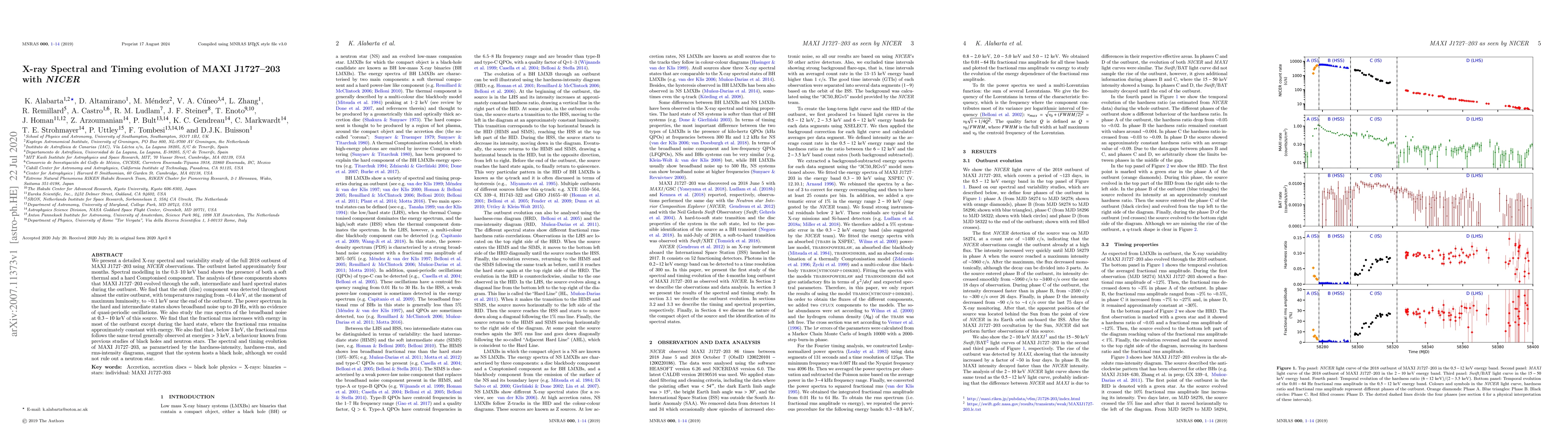 We present a detailed X-ray spectral and variability study of the full 2018 outburst of MAXI J1727-203 using NICER observations. The outburst lasted approximately four months. Spectral modelling in the 0.3-10 keV band shows the presence of both a soft thermal and a hard Comptonised component. The analysis of these components shows that MAXI J1727-203 evolved through the soft, intermediate and hard spectral states during the outburst. We find that the soft (disc) component was detected throughout almost the entire outburst, with temperatures ranging from ~0.4 keV, at the moment of maximum luminosity, to ~0.1 keV near the end of the outburst. The power spectrum in the hard and intermediate states shows broadband noise up to 20 Hz, with no evidence of quasi-periodic oscillations. We also study the rms spectra of the broadband noise at 0.3-10 keV of this source. We find that the fractional rms increases with energy in most of the outburst except during the hard state, where the fractional rms remains approximately constant with energy. We also find that, below 3 keV, the fractional rms follows the same trend generally observed at energies >3 keV, a behaviour known from previous studies of black holes and neutron stars. The spectral and timing evolution of MAXI J1727-203, as parametrised by the hardness-intensity, hardness-rms, and rms-intensity diagrams, suggest that the system hosts a black hole, although we could not rule out a neutron star.