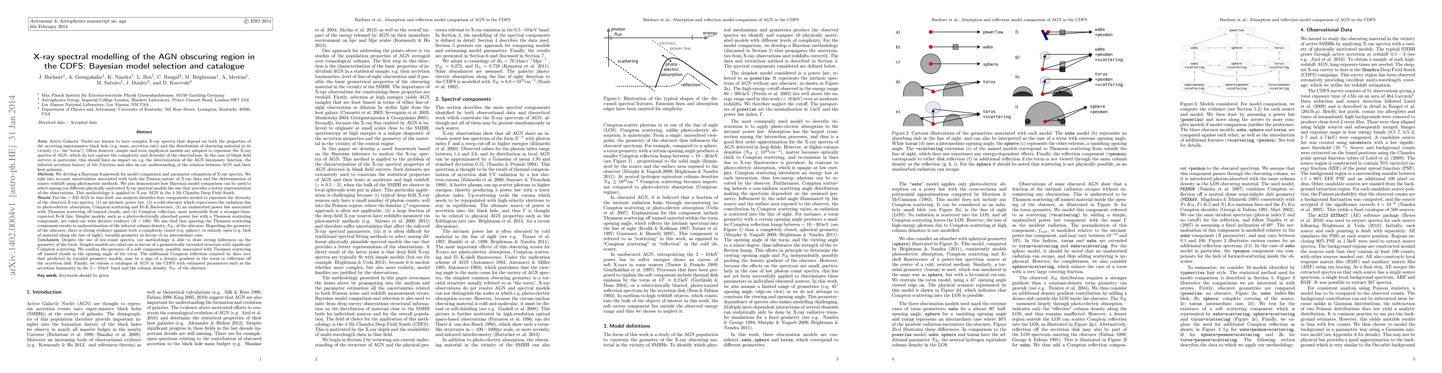 AGN are known to have complex X-ray spectra that depend on both the properties of the accreting SMBH (e.g. mass, accretion rate) and the distribution of obscuring material in its vicinity ("torus"). Often however, simple and even unphysical models are adopted to represent the X-ray spectra of AGN. In the case of blank field surveys in particular, this should have an impact on e.g. the determination of the AGN luminosity function, the inferred accretion history of the Universe and also on our understanding of the relation between AGN and their host galaxies. We develop a Bayesian framework for model comparison and parameter estimation of X-ray spectra. We take into account uncertainties associated with X-ray data and photometric redshifts. We also demonstrate how Bayesian model comparison can be used to select among ten different physically motivated X-ray spectral models the one that provides a better representation of the observations. Despite the use of low-count spectra, our methodology is able to draw strong inferences on the geometry of the torus. For a sample of 350 AGN in the 4 Ms Chandra Deep Field South field, our analysis identifies four components needed to represent the diversity of the observed X-ray spectra: (abridged). Simpler models are ruled out with decisive evidence in favour of a geometrically extended structure with significant Compton scattering. Regarding the geometry of the obscurer, there is strong evidence against both a completely closed or entirely open toroidal geometry, in favour of an intermediate case. The additional Compton reflection required by data over that predicted by toroidal geometry models, may be a sign of a density gradient in the torus or reflection off the accretion disk. Finally, we release a catalogue with estimated parameters such as the accretion luminosity in the 2-10 keV band and the column density, $N_{H}$, of the obscurer.