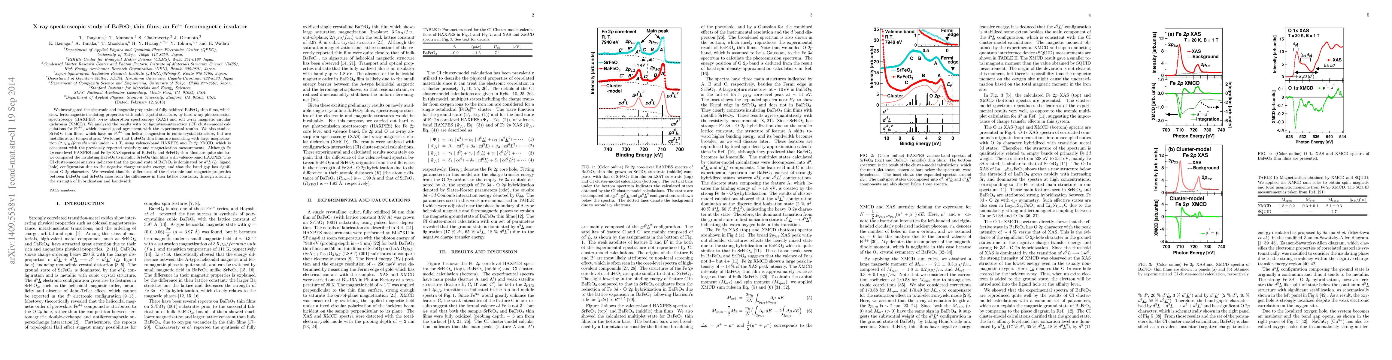 This paper investigates the electronic and magnetic properties of BaFeO$_3$ thin films using hard x-ray photoemission spectroscopy and x-ray magnetic circular dichroism, revealing it to be a ferromagnetic insulating material with a large magnetization. The study contrasts BaFeO$_3$ with metallic SrFeO$_3$, attributing differences in electronic and magnetic properties to variations in lattice constants and hybridization strength.