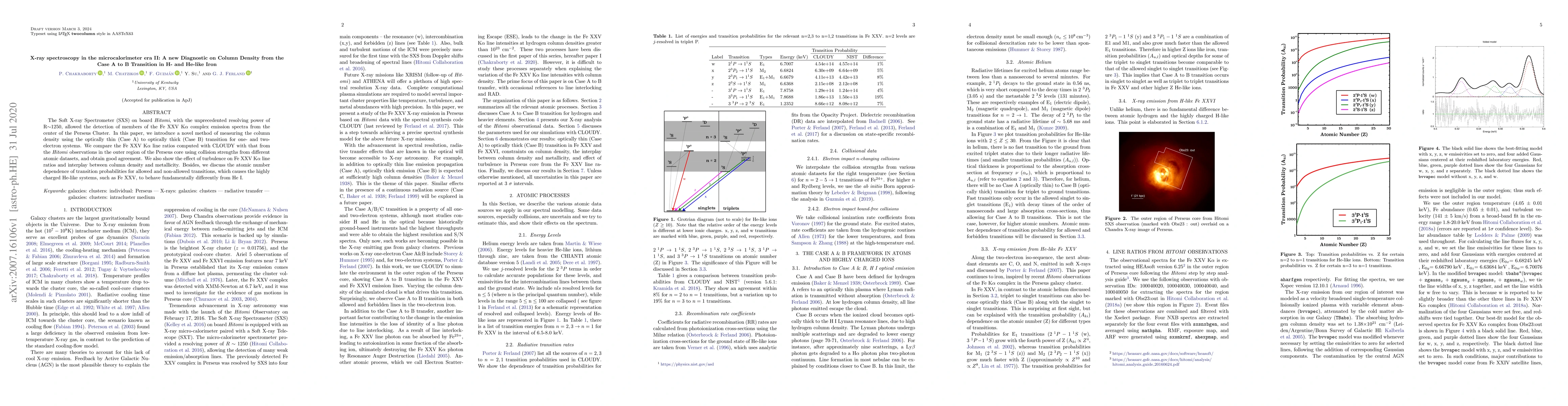 This paper introduces a new diagnostic method for measuring column density using the transition from Case A to Case B in H- and He-like iron, utilizing data from the \textit{Hitomi} Soft X-ray Spectrometer. It demonstrates good agreement between observed Fe XXV K$\alpha$ line ratios and theoretical computations, highlighting the influence of turbulence and metallicity on these ratios.
