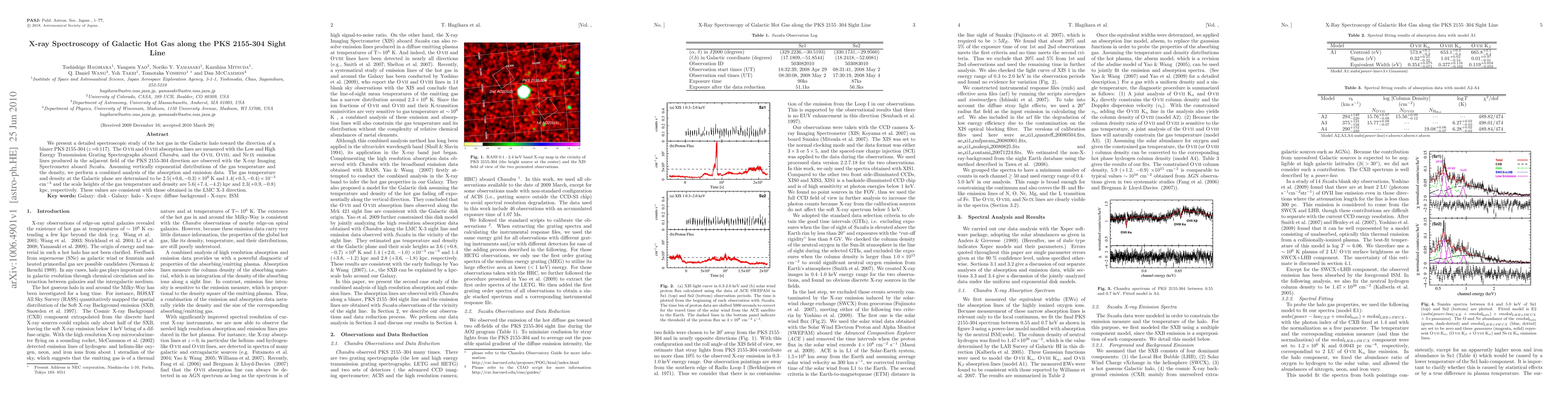 We present a detailed spectroscopic study of the hot gas in the Galactic halo toward the direction of a blazer PKS 2155-304 (z=0.117). The OVII and OVIII absorption lines are measured with the Low and High Energy Transmission Grating Spectrographs aboard Chandra, and the OVII, OVIII, and NeIX emission lines produced in the adjacent field of the PKS 2155-304 direction are observed with the X-ray Imaging Spectrometer aboard Suzaku. Assuming vertically exponential distributions of the gas temperature and the density, we perform a combined analysis of the absorption and emission data. The gas temperature and density at the Galactic plane are determined to be 2.5(+0.6,-0.3) MK and 1.4(+0.5,-0.4) x 10^{-3} cm^{-3} and the scale heights of the gas temperature and density are 5.6(+7.4,-4.2) kpc and 2.3(+0.9,-0.8) kpc, respectively. These values are consistent with those obtained in the LMC X-3 direction.