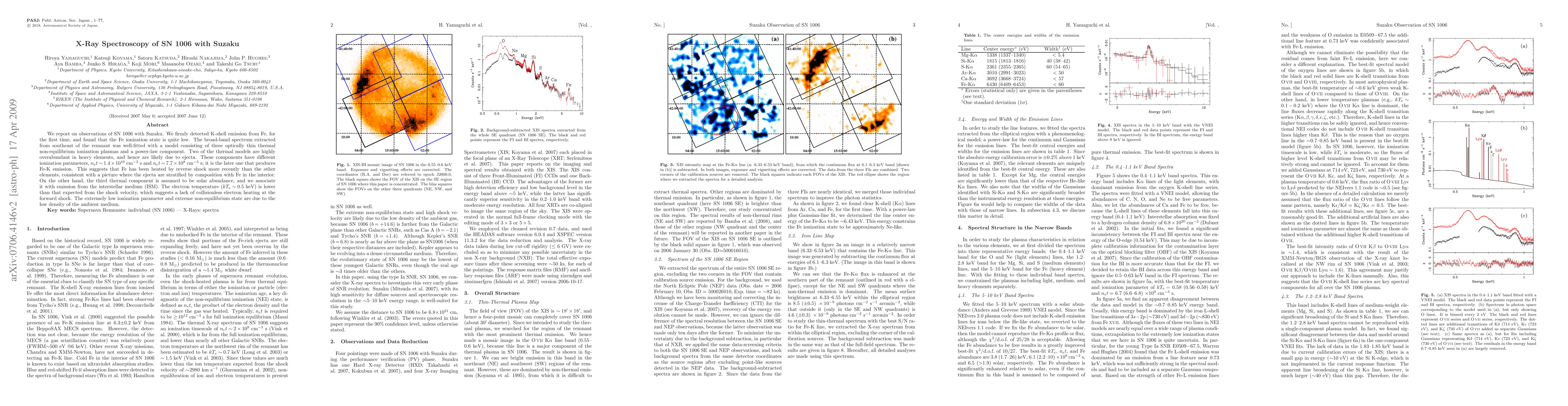 We report on observations of SN 1006 with the X-ray Imaging Spectrometers (XIS) on board Suzaku. We firmly detected K-shell emission from Fe, for the first time, and find that the Fe ionization state is quite low. The broad band spectrum extracted from the southeast of the remnant is well fitted with a model consisting of three optically thin thermal non-equilibrium ionization plasmas and a power-law component. Two of the thermal models are highly overabundant in heavy elements and, hence, are likely due to ejecta. These components have different ionization parameters: $n_et \sim 1.4\times 10^{10}$ cm$^{-3}$ s and $n_et \sim 7.7\times 10^8$ cm$^{-3}$ s and it is the later one that produces the Fe-K emission. This suggests that Fe has been heated by the reverse shock more recently than the other elements, consistent with a picture where the ejecta are stratified by composition with Fe in the interior. On the other hand, the third thermal component is assumed to be solar abundance, and we associate it with emission from the interstellar medium (ISM). The electron temperature and ionization parameter are $kT_e \sim $0.5 keV and $n_et \sim 5.8\times 10^9$ cm$^{-3}$ s. The electron temperature is lower than that expected from the shock velocity which suggests a lack of collisionless electron heating at the forward shock. The extremely low ionization parameter and extreme non-equilibrium state are due to the low density of the ambient medium.