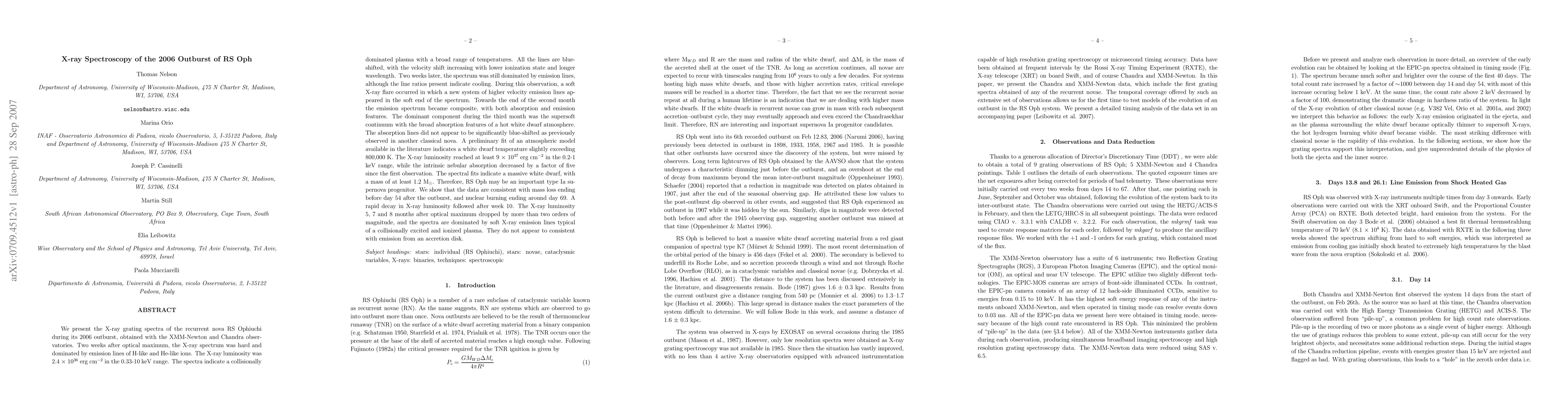 This study analyzes X-ray spectra from the 2006 outburst of RS Oph using XMM-Newton and Chandra, revealing a hard X-ray spectrum dominated by emission lines two weeks post-outburst, indicating a collisionally dominated plasma. The X-ray luminosity peaked at 9 x 10^37 erg s^-1, suggesting a massive white dwarf progenitor, potentially leading to a type Ia supernova.