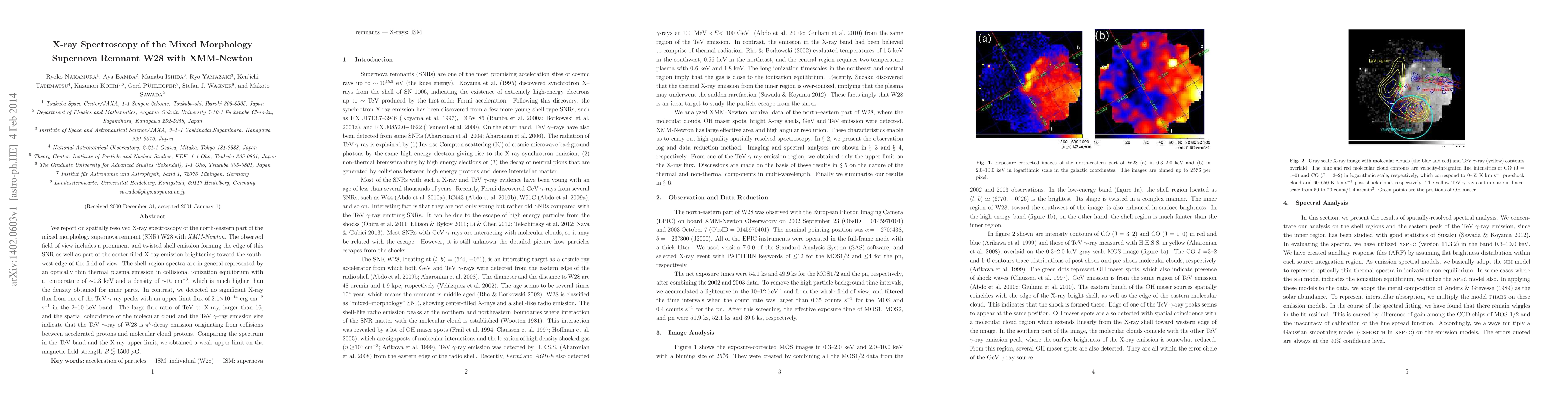 This study uses XMM-Newton to analyze the X-ray spectra of the north-eastern part of the mixed morphology supernova remnant W28, revealing a shell region with a temperature of ~0.3 keV and a density of ~10 cm$^{-3}$. The research found no significant X-ray flux from a TeV gamma-ray peak, suggesting the TeV emission is from proton-proton collisions in a molecular cloud, with a weak upper limit on the magnetic field strength of ~1500 μG.