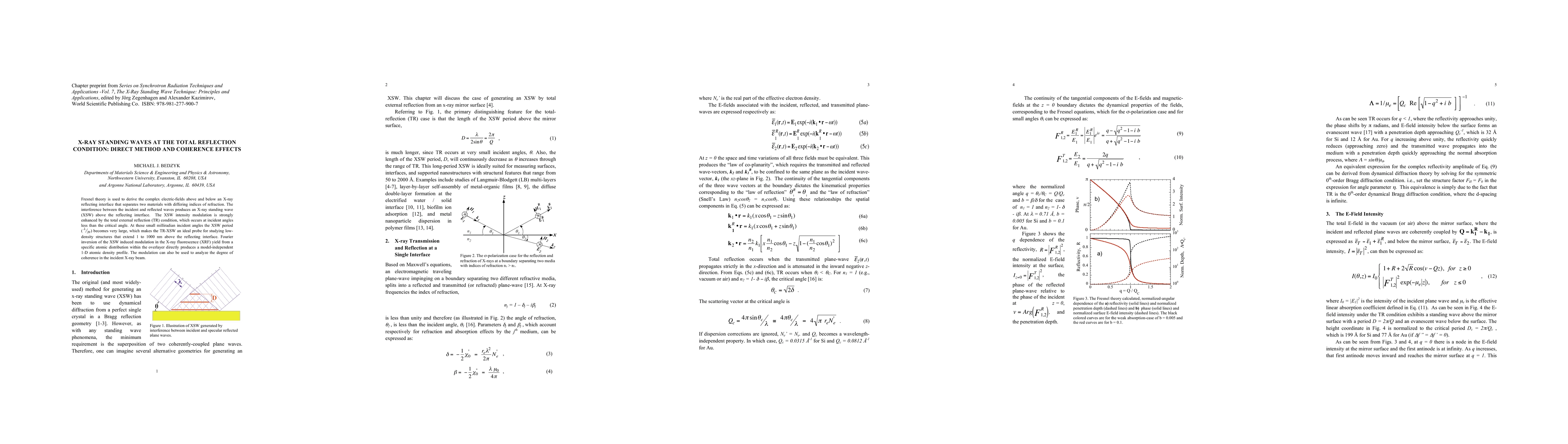 This paper derives complex electric fields above and below an X-ray reflecting interface using Fresnel theory, revealing X-ray standing wave (XSW) formation and its enhancement under total external reflection conditions. The study utilizes XSW to probe low-density structures and determine atomic density profiles and coherence effects in the incident X-ray beam.