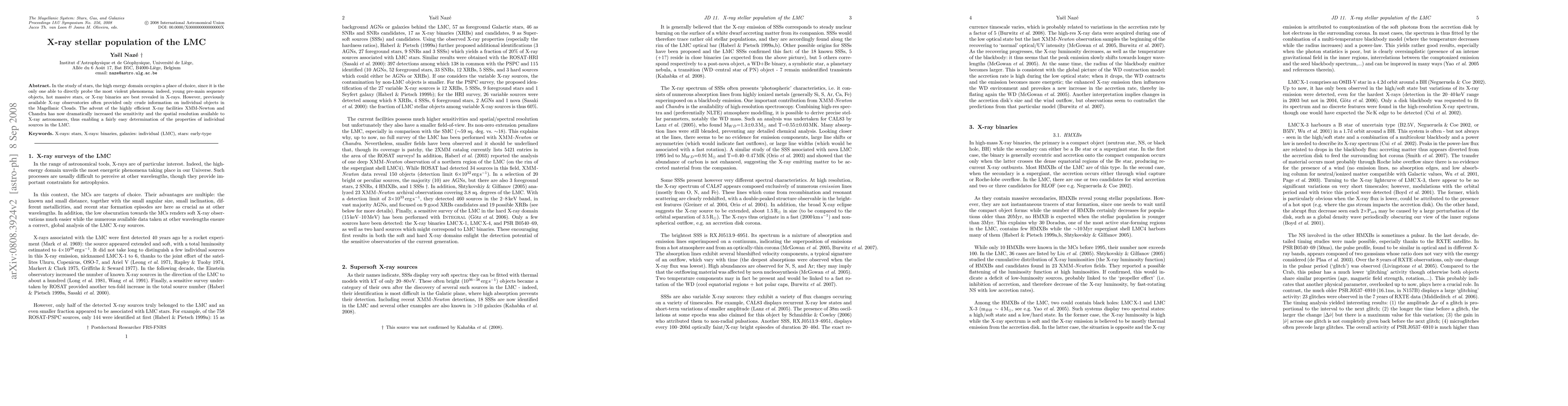 In the study of stars, the high energy domain occupies a place of choice, since it is the only one able to directly probe the most violent phenomena: indeed, young pre-main sequence objects, hot massive stars, or X-ray binaries are best revealed in X-rays. However, previously available X-ray observatories often provided only crude information on individual objects in the Magellanic Clouds. The advent of the highly efficient X-ray facilities XMM-Newton and Chandra has now dramatically increased the sensitivity and the spatial resolution available to X-ray astronomers, thus enabling a fairly easy determination of the properties of individual sources in the LMC.