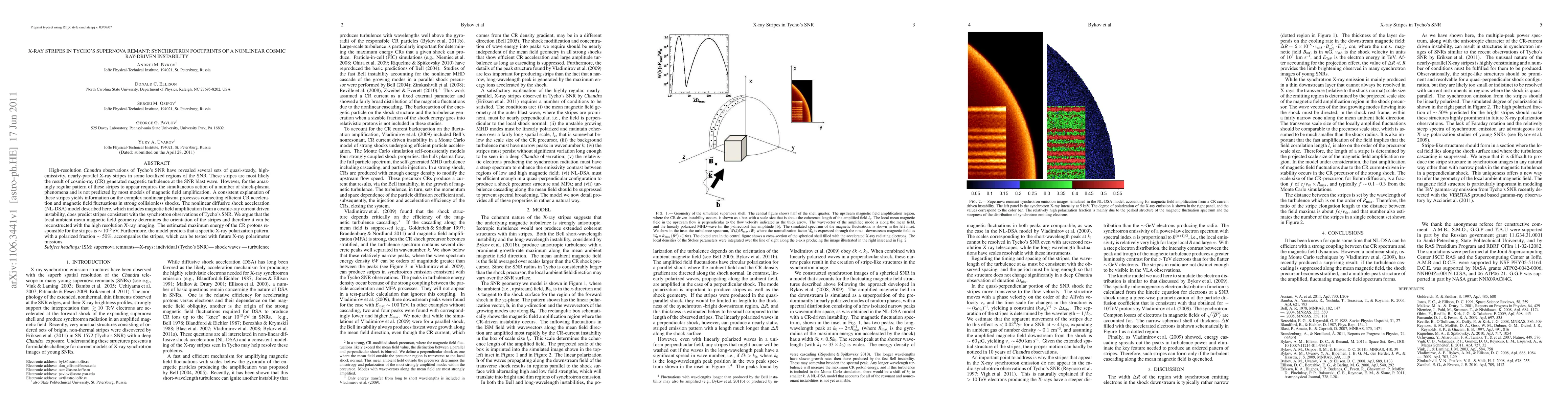 High-resolution Chandra observations of Tycho's SNR reveal X-ray stripes likely caused by cosmic-ray-driven magnetic turbulence. A nonlinear diffusive shock acceleration model predicts these stripes and suggests they reveal the ambient magnetic field geometry and could exhibit a 50% X-ray polarization.