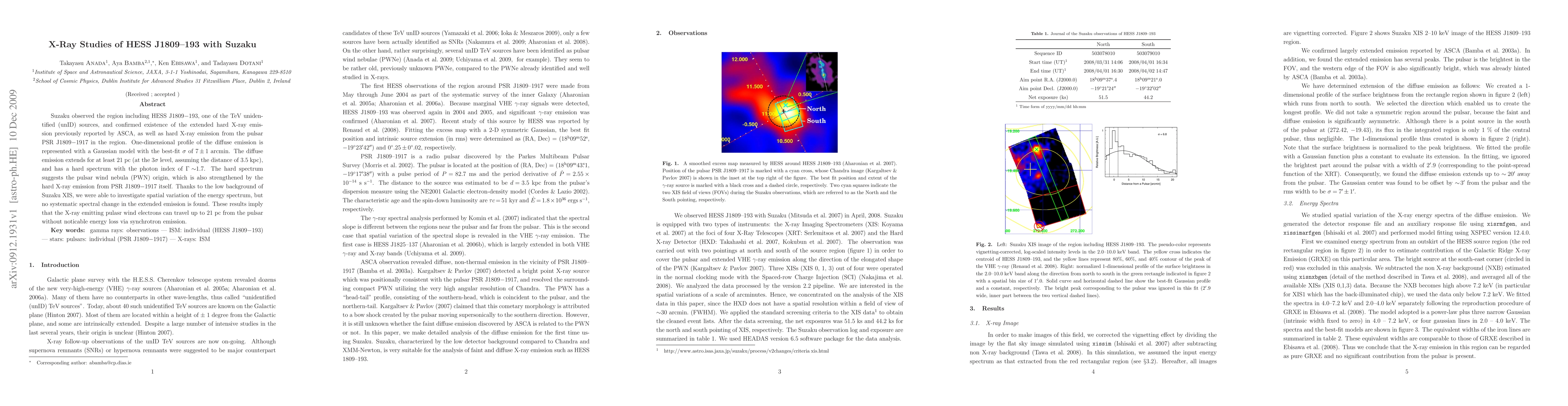 Suzaku confirmed extended hard X-ray emission from HESS J1809-193, likely a pulsar wind nebula, and identified hard X-ray emission from pulsar PSR J1809-1917, with no significant spectral variation in the diffuse emission. The diffuse emission extends at least 21 pc, suggesting pulsar wind electrons travel this distance without significant energy loss.
