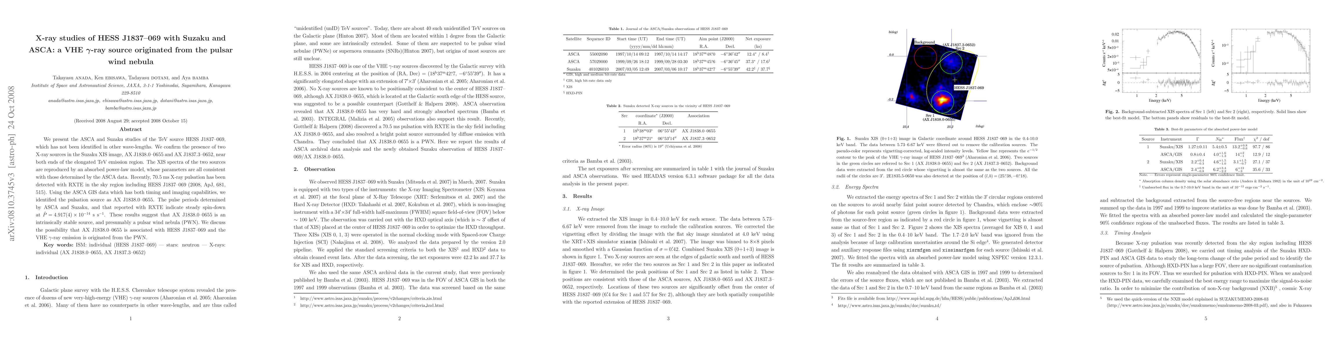 This paper confirms the presence of two X-ray sources near the TeV source HESS J1837--069, identified as AX J1838.0--0655 and AX J1837.3--0652, suggesting they are part of a pulsar wind nebula. AX J1838.0--0655 is confirmed as a pulsar with a stable spin-down, indicating a possible association with the VHE gamma-ray emission from the region.