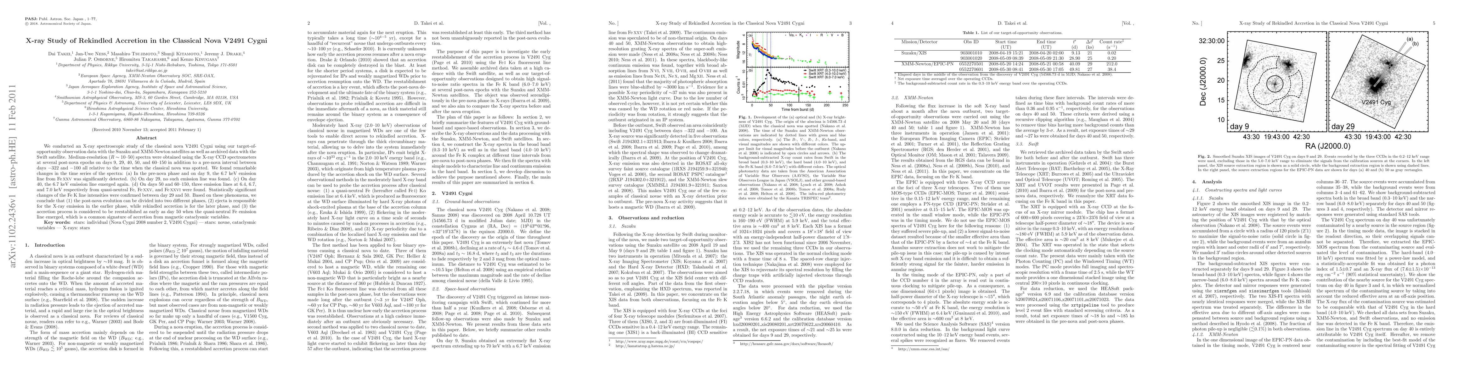 We conducted an X-ray spectroscopic study of the classical nova V2491 Cygni using our target-of-opportunity observation data with the Suzaku and XMM-Newton satellites as well as archived data with the Swift satellite. Medium-resolution (R~10-50) spectra were obtained using the X-ray CCD spectrometers at several post-nova epochs on days 9, 29, 40, 50, and 60-150 in addition to a pre-nova interval between days -322 and -100 all relative to the time when the classical nova was spotted. We found remarkable changes in the time series of the spectra: (a) In the pre-nova phase and on day 9, the 6.7 keV emission line from Fe XXV was significantly detected. (b) On day 29, no such emission line was found. (c) On day 40, the 6.7 keV emission line emerged again. (d) On days 50 and 60-150, three emission lines at 6.4, 6.7, and 7.0 keV respectively from quasi-neutral Fe, Fe XXV, and Fe XXVI were found. Statistically significant changes of the Fe K line intensities were confirmed between day 29 and 50. Based on these phenomena, we conclude that (1) the post-nova evolution can be divided into two different phases, (2) ejecta is responsible for the X-ray emission in the earlier phase, while rekindled accretion is for the later phase, and (3) the accretion process is considered to be reestablished as early as day 50 when the quasi-neutral Fe emission line emerged, which is a common signature of accretion from magnetic cataclysmic variables.