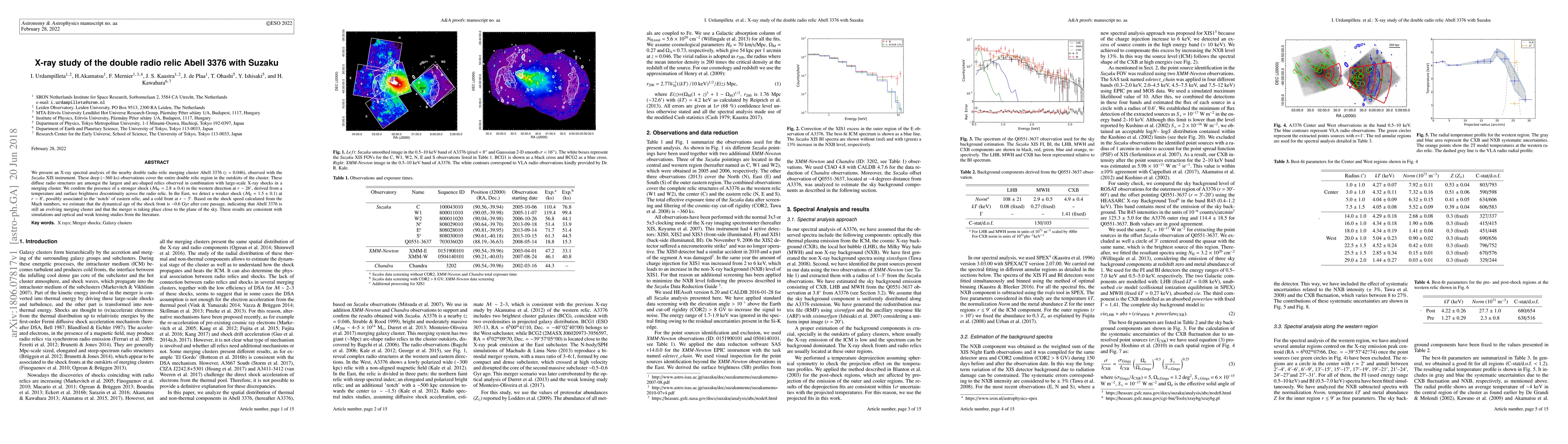 We present an X-ray spectral analysis of the nearby double radio relic merging cluster Abell 3376 ($z$ = 0.046), observed with the $Suzaku$ XIS instrument. These deep ($\sim$360 ks) observations cover the entire double relic region in the outskirts of the cluster. These diffuse radio structures are amongst the largest and arc-shaped relics observed in combination with large-scale X-ray shocks in a merging cluster. We confirm the presence of a stronger shock (${\cal M}_{\rm{W}}$ = 2.8 $\pm~0.4$) in the western direction at $r\sim26$', derived from a temperature and surface brightness discontinuity across the radio relic. In the East, we detect a weaker shock (${\cal M}_{\rm{E}}$ = 1.5 $\pm~0.1$) at $r\sim8$', possibly associated to the 'notch' of eastern relic, and a cold front at $r\sim3$'. Based on the shock speed calculated from the Mach numbers, we estimate that the dynamical age of the shock front is $\sim$0.6 Gyr after core passage, indicating that Abell 3376 is still an evolving merging cluster and that the merger is taking place close to the plane of the sky. These results are consistent with simulations and optical and weak lensing studies from the literature.