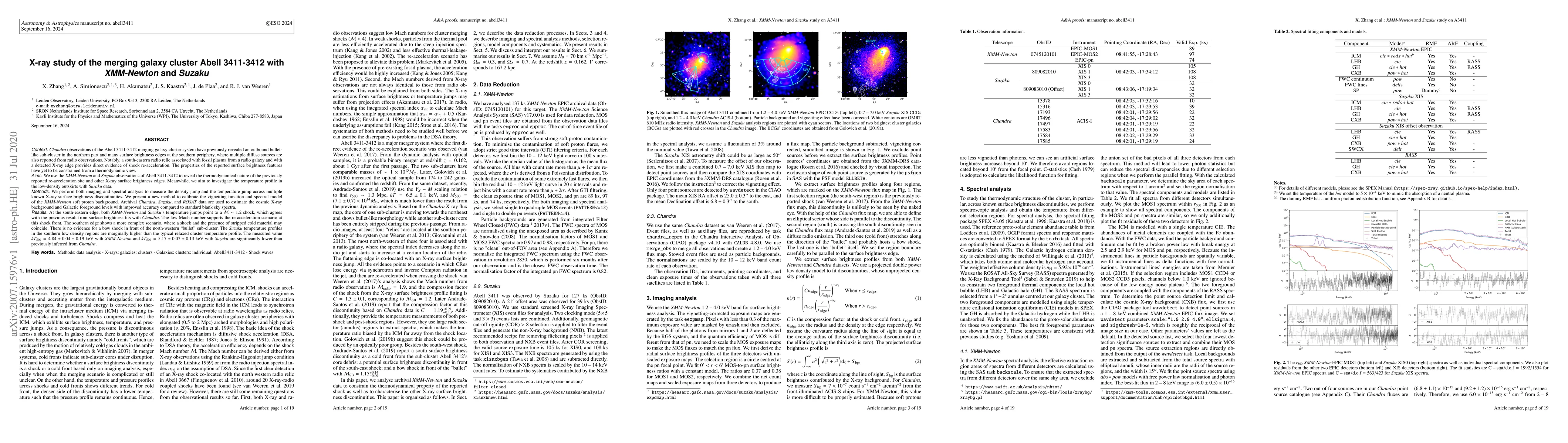 Context: Chandra observations of the Abell 3411-3412 merging system have revealed an outbound bullet-like sub-cluster in the northern part and many surface brightness (SB) edges at the southern periphery, where multiple diffuse sources are also reported from radio observations. Notably, a south-eastern radio relic associated with fossil plasma from a radio galaxy and with a detected X-ray edge provides direct evidence of shock re-acceleration. The properties of the reported X-ray edges have yet to be constrained from a thermodynamic view. Aims: We use the XMM-Newton and Suzaku observations to reveal the thermodynamical nature of the reported re-acceleration site and other X-ray edges. Meanwhile, we aim to investigate the temperature profile in the low-density outskirts with Suzaku data. Methods: We perform both imaging and spectral analysis to measure the density jump and the temperature jump across multiple known X-ray SB discontinuities. We present a new method to calibrate the XMM-Newton soft proton background. Archival Chandra, Suzaku, and ROSAT data are used to estimate the cosmic X-ray background and Galactic foreground levels with improved accuracy compared to standard blank sky spectra. Results: At the south-eastern edge, both XMM-Newton and Suzaku's temperature jumps point to a $\mathcal{M}\sim1.2$ shock, which agrees with result from SB fits with Chandra, and supports the re-acceleration scenario at this shock front. The southern edge shows a more complex scenario, where a shock and the presence of stripped cold material may coincide. The Suzaku temperature profiles in the southern low density regions are marginally higher than the typical relaxed cluster temperature profile. The measured value $kT_{500}=4.84\pm0.04\pm0.19$ keV with XMM-Newton and $kT_{500}=5.17\pm0.07\pm0.13$ keV with Suzaku are significantly lower than previously inferred from Chandra.