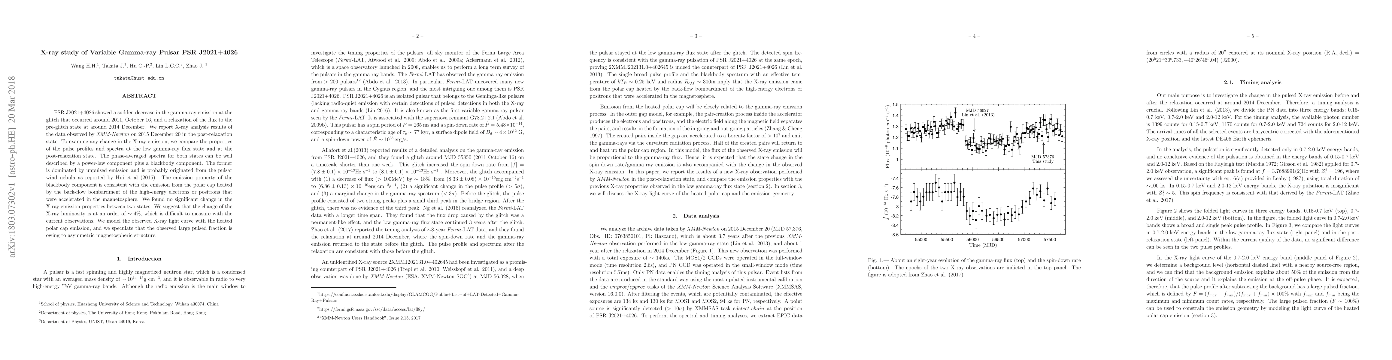 The X-ray study of PSR J2021+4026 reveals no significant change in emission properties following a gamma-ray glitch, with both low and post-relaxation states showing similar power-law and blackbody components. The observed X-ray light curve suggests a possible asymmetric magnetospheric structure.