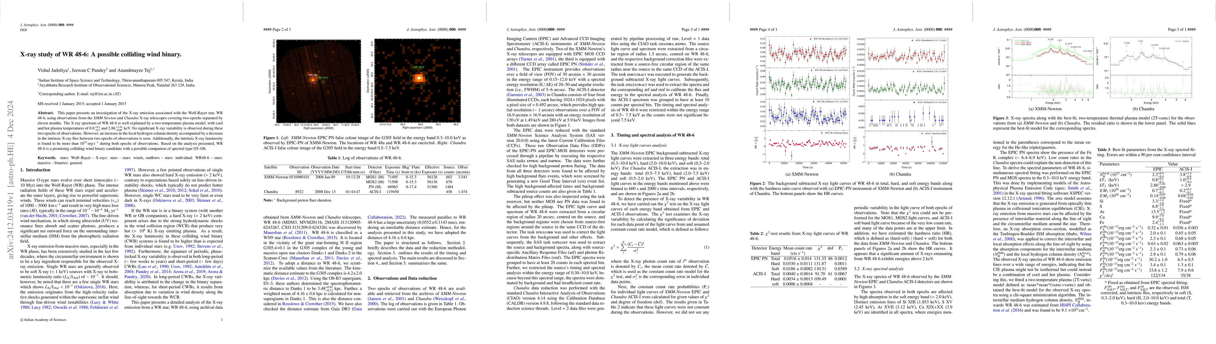 This study investigates X-ray emissions from the Wolf-Rayet star WR 48-6 using XMM Newton and Chandra observations, suggesting it may be a colliding wind binary with a companion of spectral type O5-O6. The X-ray spectrum fits a two-temperature plasma model, with no significant variability but a noticeable decrease in intrinsic flux and increase in hydrogen column density over eleven months.