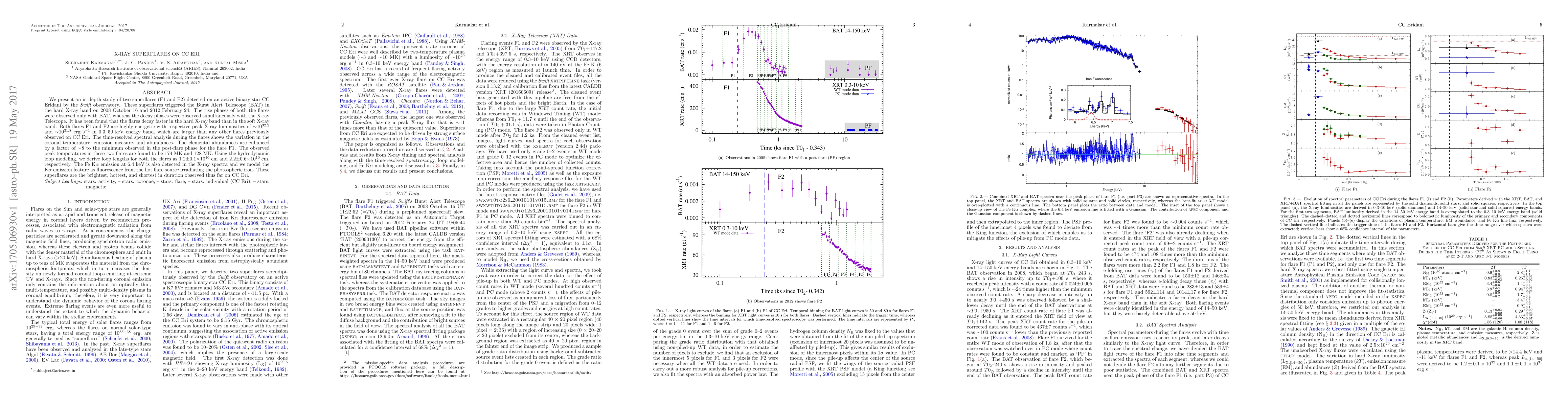 This study investigates two superflares (F1 and F2) on CC Eri detected by the Swift observatory, revealing highly energetic flares with peak luminosities exceeding previous observations. The flares decay faster in hard X-rays, and spectral analysis shows significant variations in temperature, emission measure, and enhanced elemental abundances, particularly in F1.