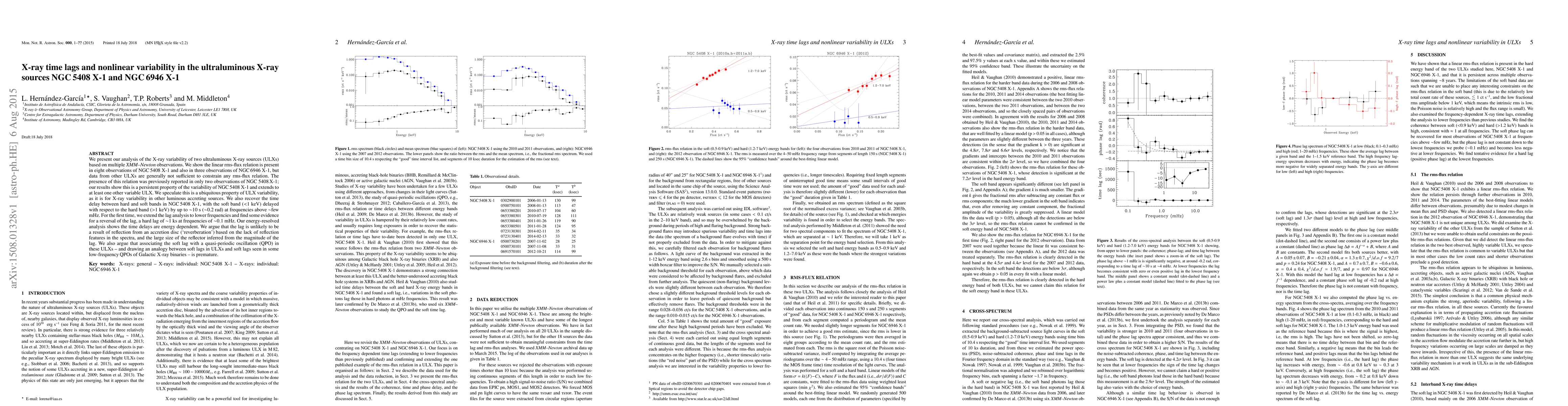 The study analyzes X-ray variability of ultraluminous X-ray sources (ULXs) NGC 5408 X-1 and NGC 6946 X-1 using XMM-Newton observations. Key findings include the persistent linear rms-flux relation in NGC 5408 X-1 and its presence in NGC 6946 X-1, time delays between soft (<1 keV) and hard (>1 keV) bands, and energy-dependent time delays. The research suggests that these properties could be common in ULX variability, and the lags are unlikely due to accretion disc reflection or quasi-periodic oscillations.
