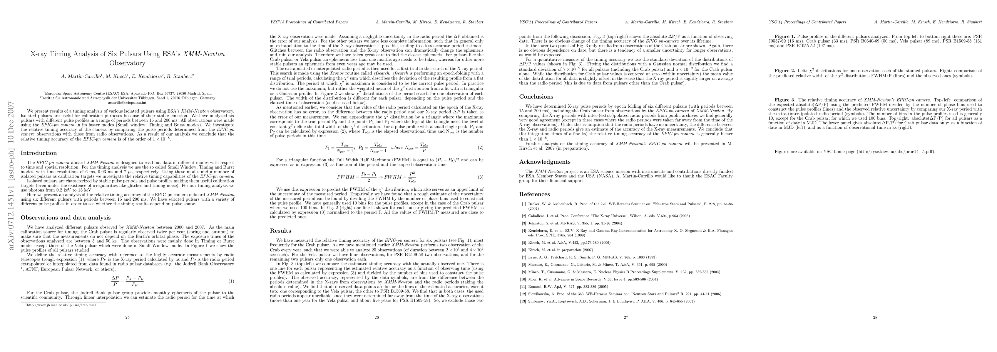 This paper reports on an X-ray timing analysis of six isolated pulsars using ESA's XMM-Newton observatory, finding that the EPIC-pn camera's relative timing accuracy is $1\times 10^{-8}$, validating its use for calibration purposes.