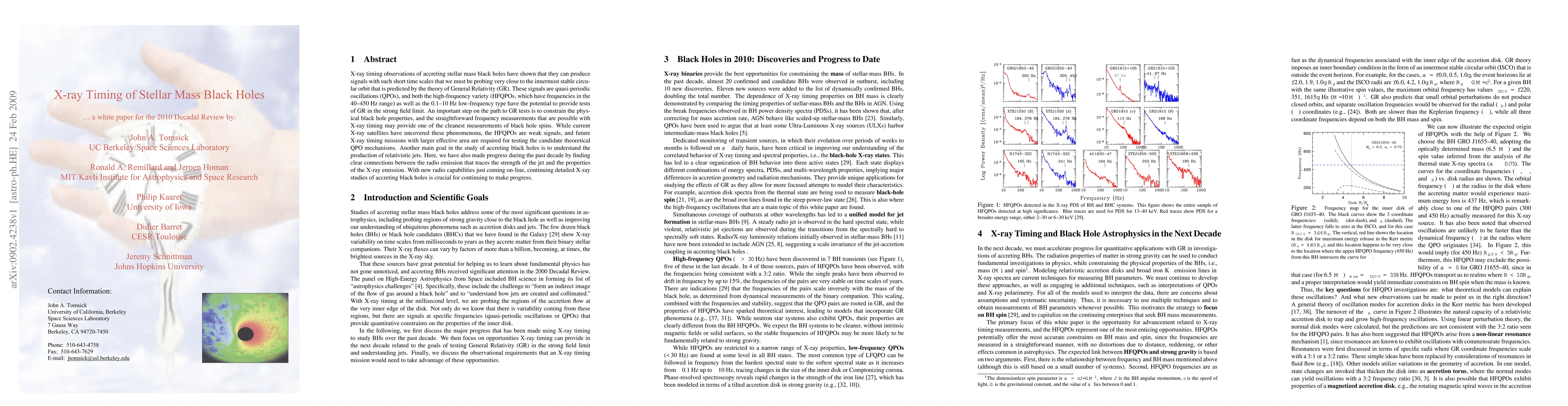 X-ray timing observations of accreting stellar mass black holes have shown that they can produce signals with such short time scales that we must be probing very close to the innermost stable circular orbit that is predicted by the theory of General Relativity (GR). These signals are quasi-periodic oscillations (QPOs), and both the high-frequency variety (HFQPOs, which have frequencies in the 40-450 Hz range) as well as the 0.1-10 Hz low-frequency type have the potential to provide tests of GR in the strong field limit. An important step on the path to GR tests is to constrain the physical black hole properties, and the straightforward frequency measurements that are possible with X-ray timing may provide one of the cleanest measurements of black hole spins. While current X-ray satellites have uncovered these phenomenona, the HFQPOs are weak signals, and future X-ray timing missions with larger effective area are required for testing the candidate theoretical QPO mechanisms. Another main goal in the study of accreting black holes is to understand the production of relativistic jets. Here, we have also made progress during the past decade by finding clear connections between the radio emission that traces the strength of the jet and the properties of the X-ray emission. With new radio capabilities just coming on-line, continuing detailed X-ray studies of accreting black holes is crucial for continuing to make progress.