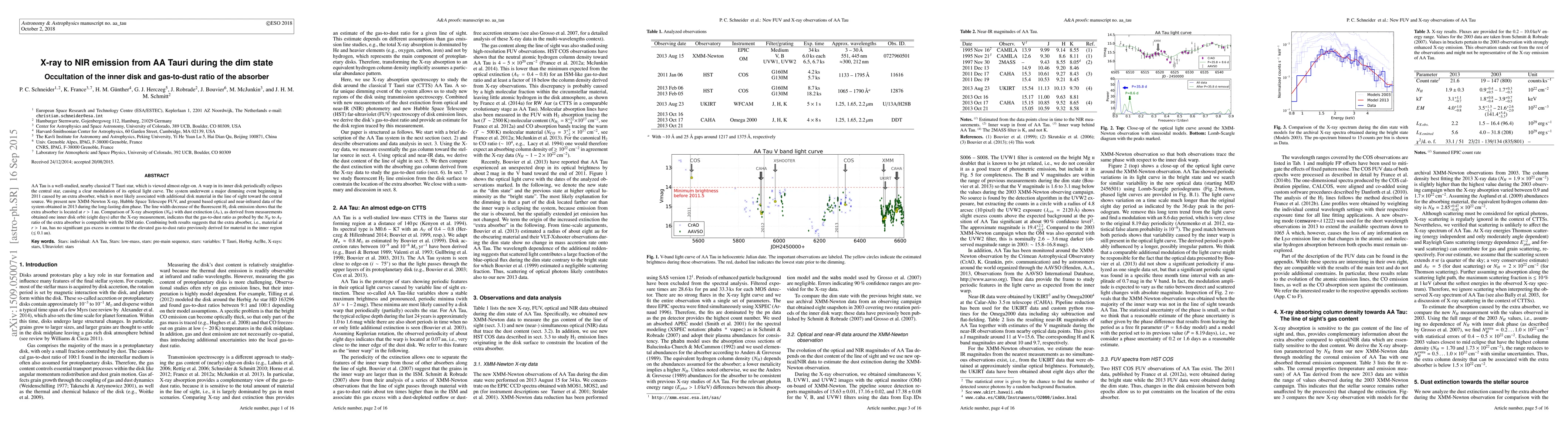 AA Tau is a well-studied, nearby classical T Tauri star, which is viewed almost edge-on. A warp in its inner disk periodically eclipses the central star, causing a clear modulation of its optical light curve. The system underwent a major dimming event beginning in 2011 caused by an extra absorber, which is most likely associated with additional disk material in the line of sight toward the central source. We present new XMM-Newton X-ray, Hubble Space Telescope FUV, and ground based optical and near-infrared data of the system obtained in 2013 during the long-lasting dim phase. The line width decrease of the fluorescent H$_2$ disk emission shows that the extra absorber is located at $r>1\,$au. Comparison of X-ray absorption ($N_H$) with dust extinction ($A_V$), as derived from measurements obtained one inner disk orbit (eight days) after the X-ray measurement, indicates that the gas-to-dust ratio as probed by the $N_H$ to $A_V$ ratio of the extra absorber is compatible with the ISM ratio. Combining both results suggests that the extra absorber, i.e., material at $r>1\,$au, has no significant gas excess in contrast to the elevated gas-to-dust ratio previously derived for material in the inner region ($\lesssim0.1\,$au).