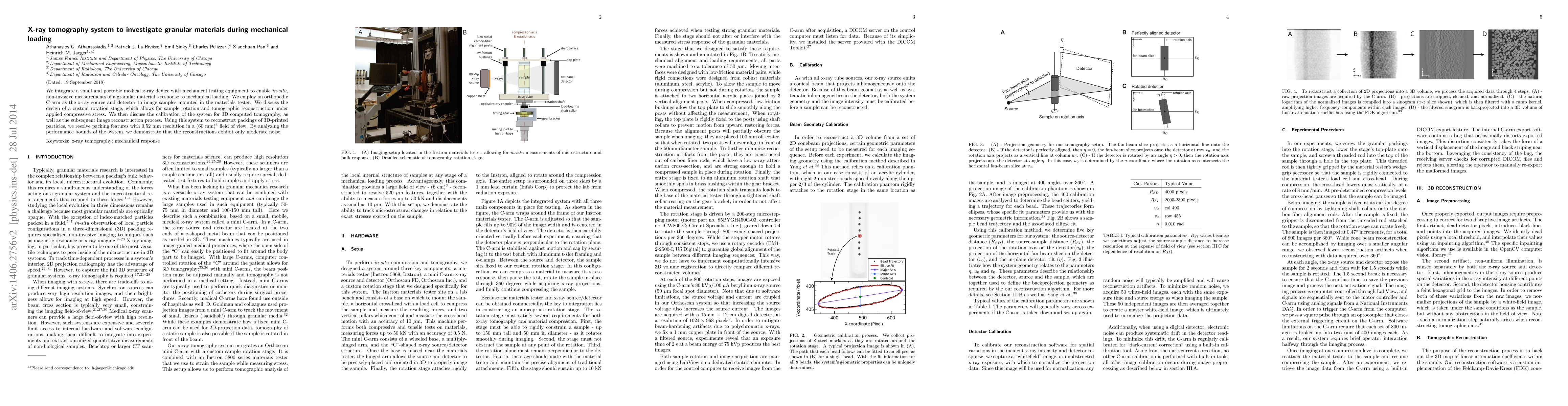 This paper describes a portable x-ray tomography system combining a medical C-arm with mechanical testing equipment for in-situ imaging of granular materials under stress. The system achieves 0.52 mm resolution in a 60 mm$^3$ field of view, demonstrating moderate noise in reconstructions.