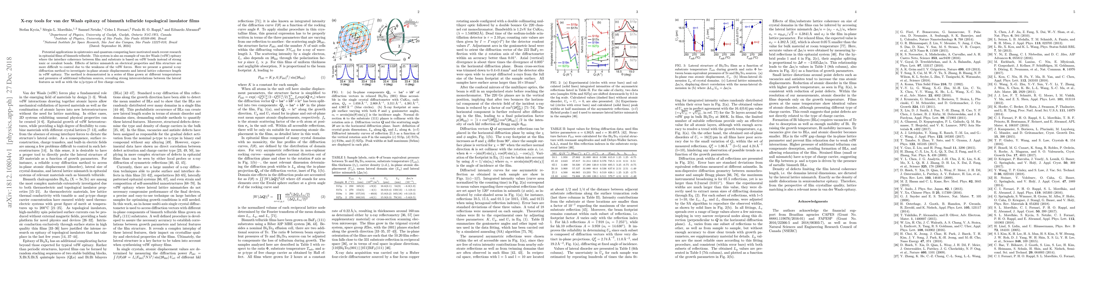 This paper introduces an x-ray diffraction technique to study atomic displacements and coherence in van der Waals epitaxy of bismuth telluride films, revealing the effects of growth conditions on film structure and electrical properties. The findings highlight intercorrelations between growth parameters, film characteristics, and charge carrier types.