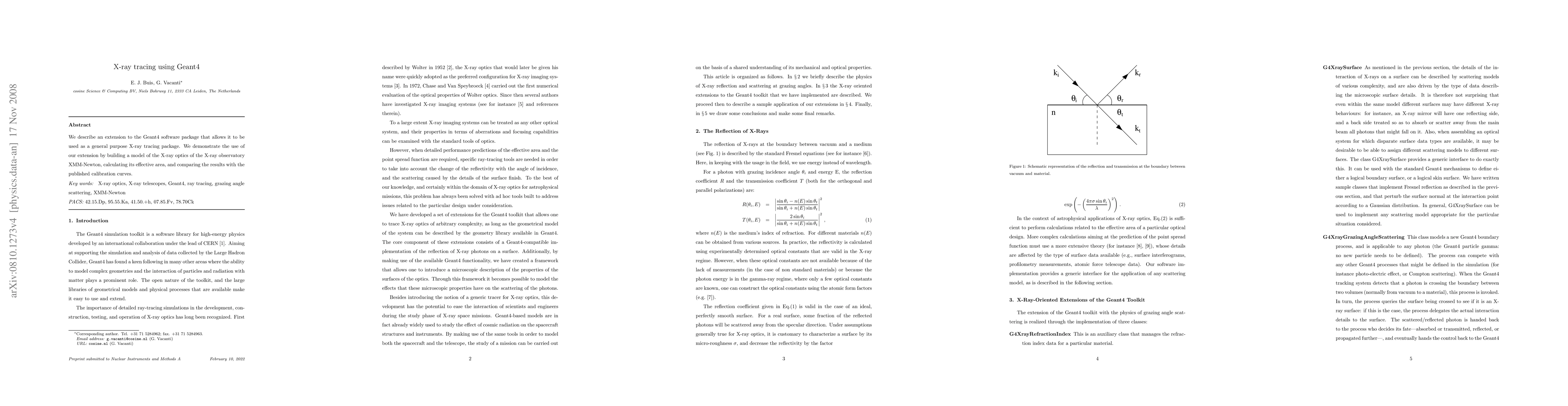 This paper presents an extension to the Geant4 software for X-ray tracing, demonstrating its application by modeling the XMM-Newton's X-ray optics, calculating its effective area, and comparing results with published calibration curves.