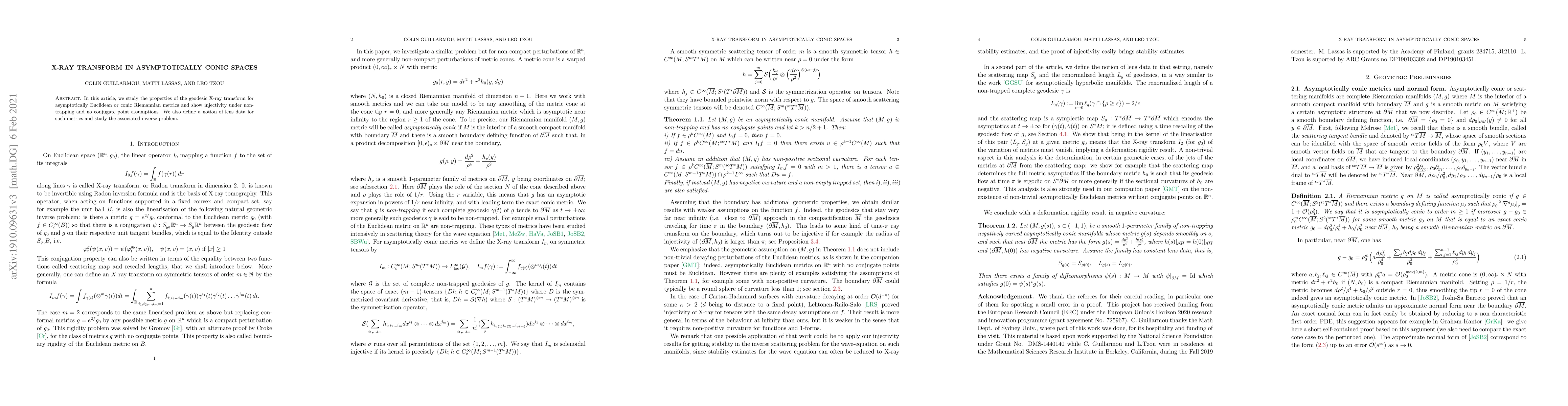 This paper investigates the geodesic X-ray transform for asymptotically conic or Euclidean Riemannian metrics, proving its injectivity under non-trapping conditions and no conjugate points. It also introduces the concept of lens data and explores the related inverse problem.