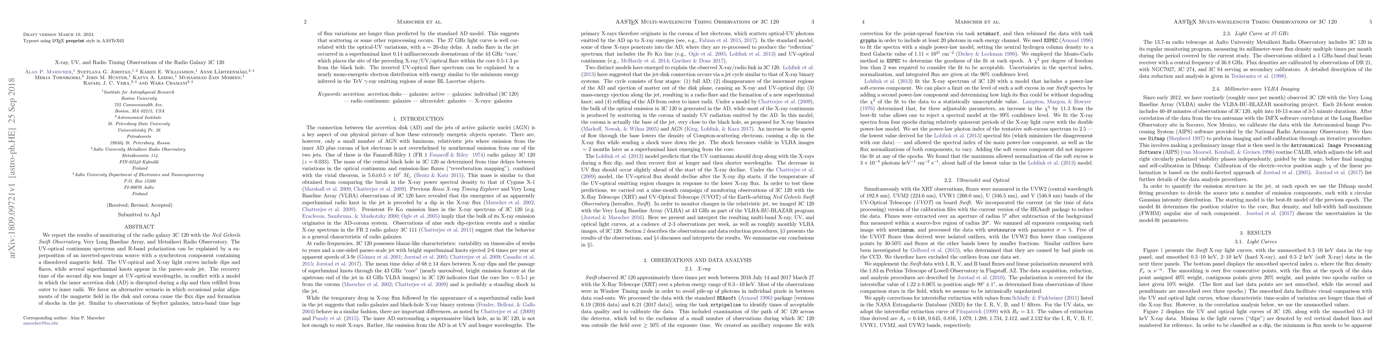 The radio galaxy 3C 120 exhibited UV-optical continuum spectrum and R-band polarization that can be explained by a superposition of an inverted-spectrum source with a synchrotron component. The light curves showed dips and flares, with longer recovery times than predicted by standard accretion disk models, suggesting scattering or reprocessing occurs.