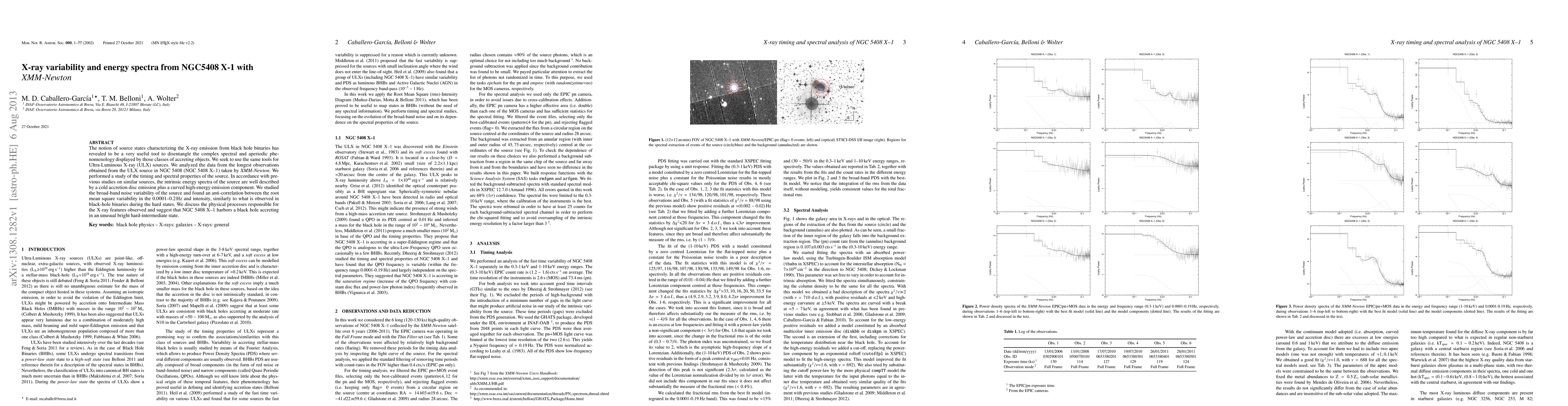 This study analyzes the X-ray variability and energy spectra of NGC 5408 X-1 using XMM-Newton data, revealing an anti-correlation between variability and intensity akin to black-hole binaries in hard states, suggesting the presence of a black hole in an unusual bright state. The source's spectra are well-fitted by a cold accretion disc plus a high-energy component.