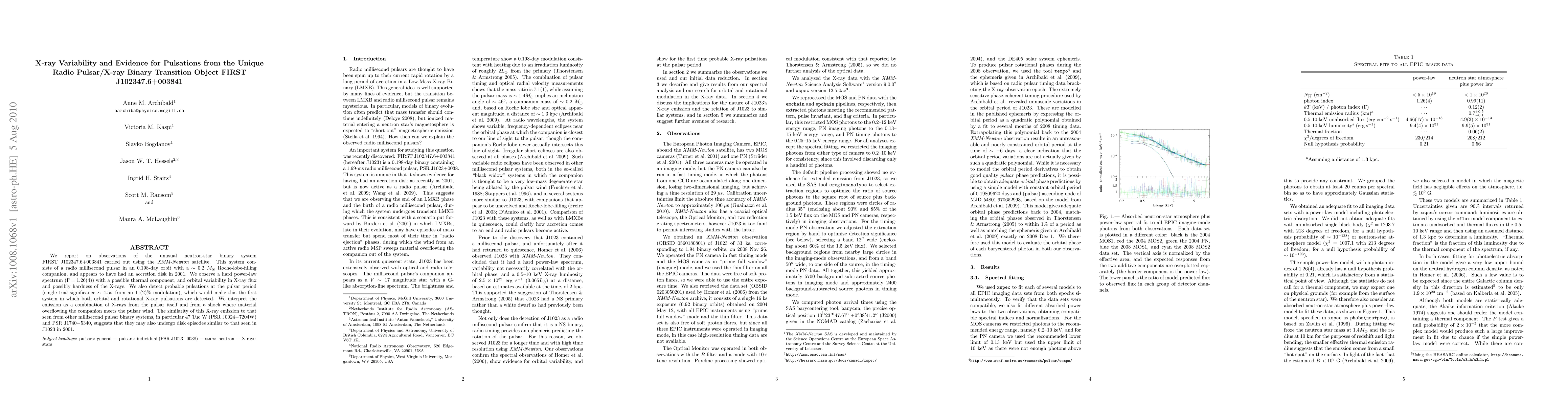 We report on observations of the unusual neutron-star binary system FIRST J102347.6+003841 carried out using the XMM-Newton satellite. This system consists of a radio millisecond pulsar in an 0.198-day orbit with a ~0.2 solar-mass Roche-lobe-filling companion, and appears to have had an accretion disk in 2001. We observe a hard power-law spectrum (\Gamma = 1.26(4)) with a possible thermal component, and orbital variability in X-ray flux and possibly hardness of the X-rays. We also detect probable pulsations at the pulsar period (single-trial significance ~4.5 sigma from an 11(2)% modulation), which would make this the first system in which both orbital and rotational X-ray pulsations are detected. We interpret the emission as a combination of X-rays from the pulsar itself and from a shock where material overflowing the companion meets the pulsar wind. The similarity of this X-ray emission to that seen from other millisecond pulsar binary systems, in particular 47 Tuc W (PSR J0024-7204W) and PSR J1740-5340, suggests that they may also undergo disk episodes similar to that seen in J1023 in 2001.