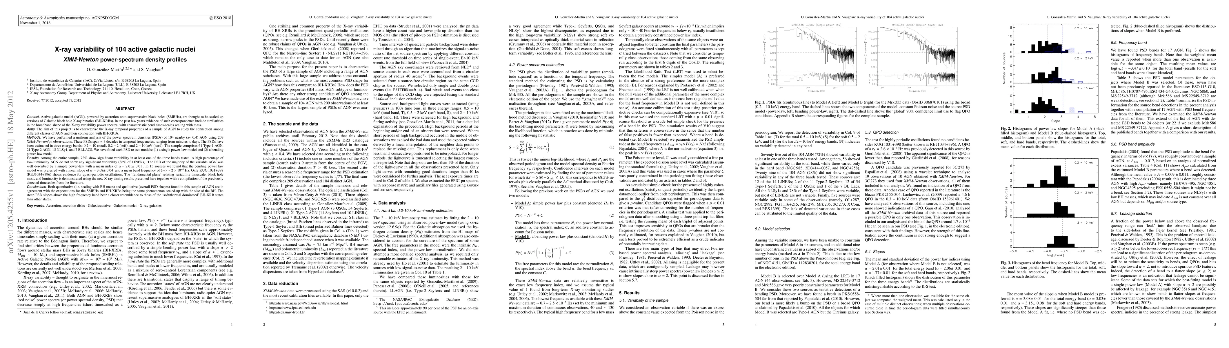 This study analyzes the X-ray variability power spectrum densities (PSDs) of 104 nearby active galactic nuclei (AGN) using XMM-Newton observations, revealing that 72% exhibit significant variability. The PSDs generally follow a power-law model, with some sources showing a bending power-law indicative of a fundamental plane relating variability, black hole mass, and luminosity, consistent with scaled-up black hole X-ray binaries.