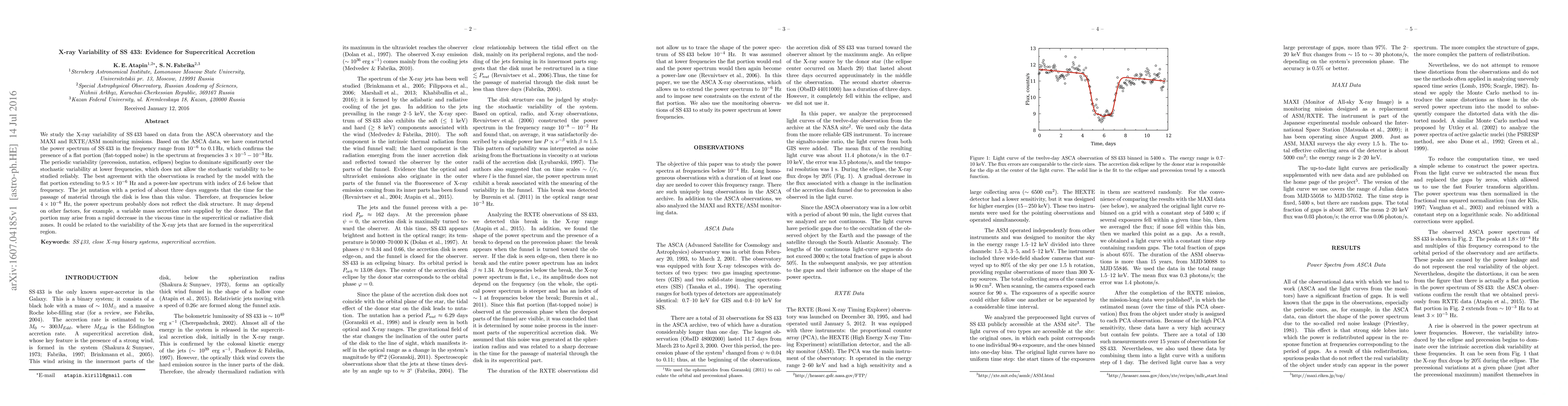 The X-ray variability of SS 433 shows a flat portion in its power spectrum at specific frequencies, suggesting supercritical accretion, while periodic variability dominates at lower frequencies.