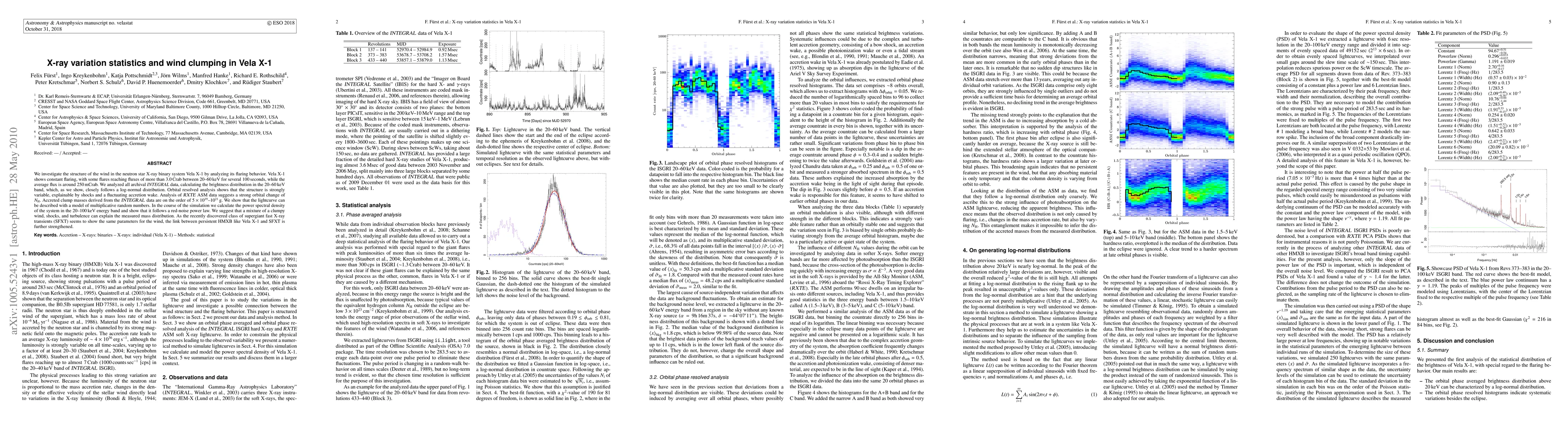This paper analyzes the flaring behavior and wind structure in the neutron star X-ray binary Vela X-1, revealing a log-normal brightness distribution and a red-noise power law in its lightcurve. The study suggests a clumpy wind, shocks, and turbulence explain the observed mass distribution and the persistent high-mass X-ray binary's similarity to supergiant fast X-ray transients.